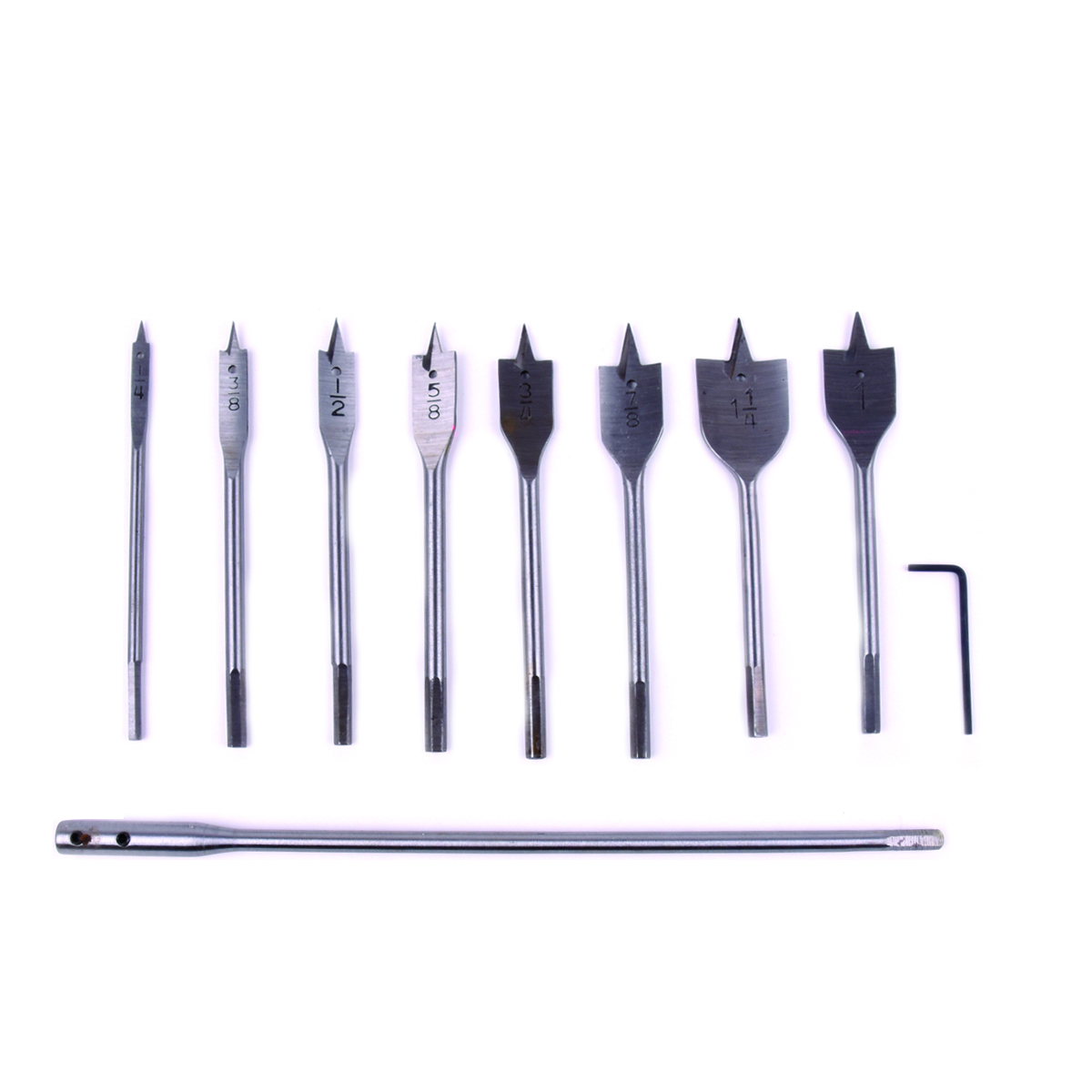 Contains: 1/4in, 3/8in, 1/2in, 5/8in, 3/4in, 7/8in, 1in, 1-1/4in, Complete with 12in bit extension shank, and a Hex key.
