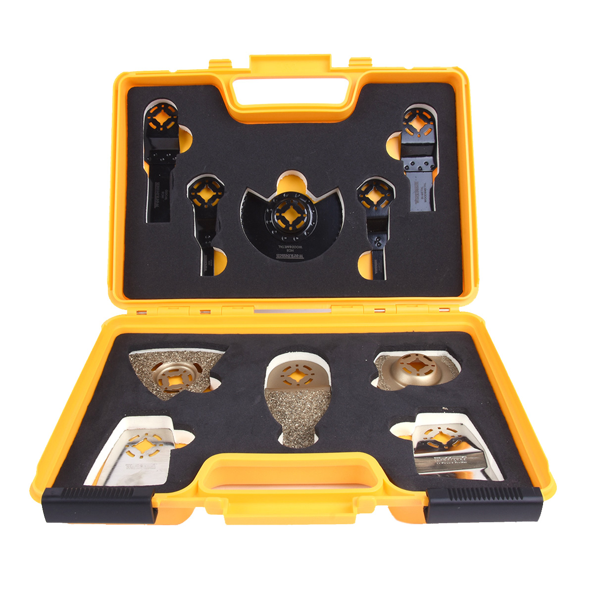 10 pieces all purpose multi tool accessory set includes: (1) hcs (65mn) pushcut wood sawblade 10mm (3/8in); (1) hcs (65mn) pushcut wood sawblade 22mm (7/8in); (1) bi-metal pushcut metal sawblade 10mm (3/8in); (1) bi-metal pushcut metal sawblade 22mm (7/8in); (1) hcs (65mn) radial sawblade radius 85mm (3-3/8in); (1) hcs (65mn) flatscraper 50mm (2in); (1) hcs (65mn) curving scraper 50mm (2in); (1) carbide grit saw blade radius 65mm (2-9/16in); (1) carbide grit deltarasp radius 80mm (3-1/8in); (1) carbide grit fingertip rasp 45mm (1-3/4in).