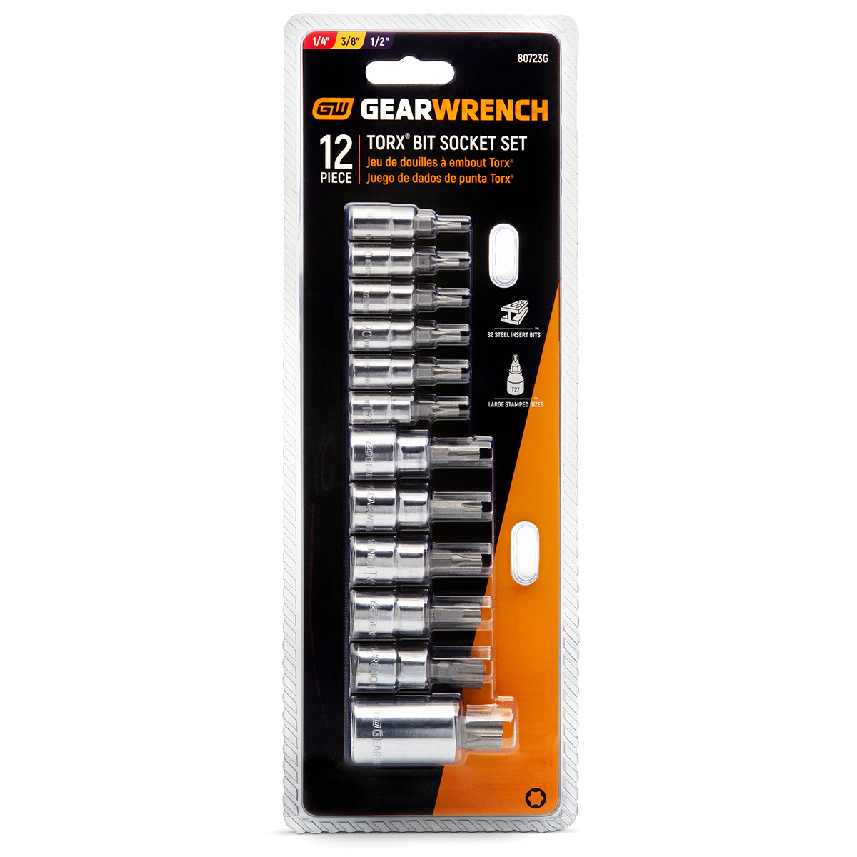 The GEARWRENCH 12pc 1/4in; 3/8in; 1/2in Drive Torx Bit Socket Set (T8 - T60) delivers durability and precision for professional and DIY applications.