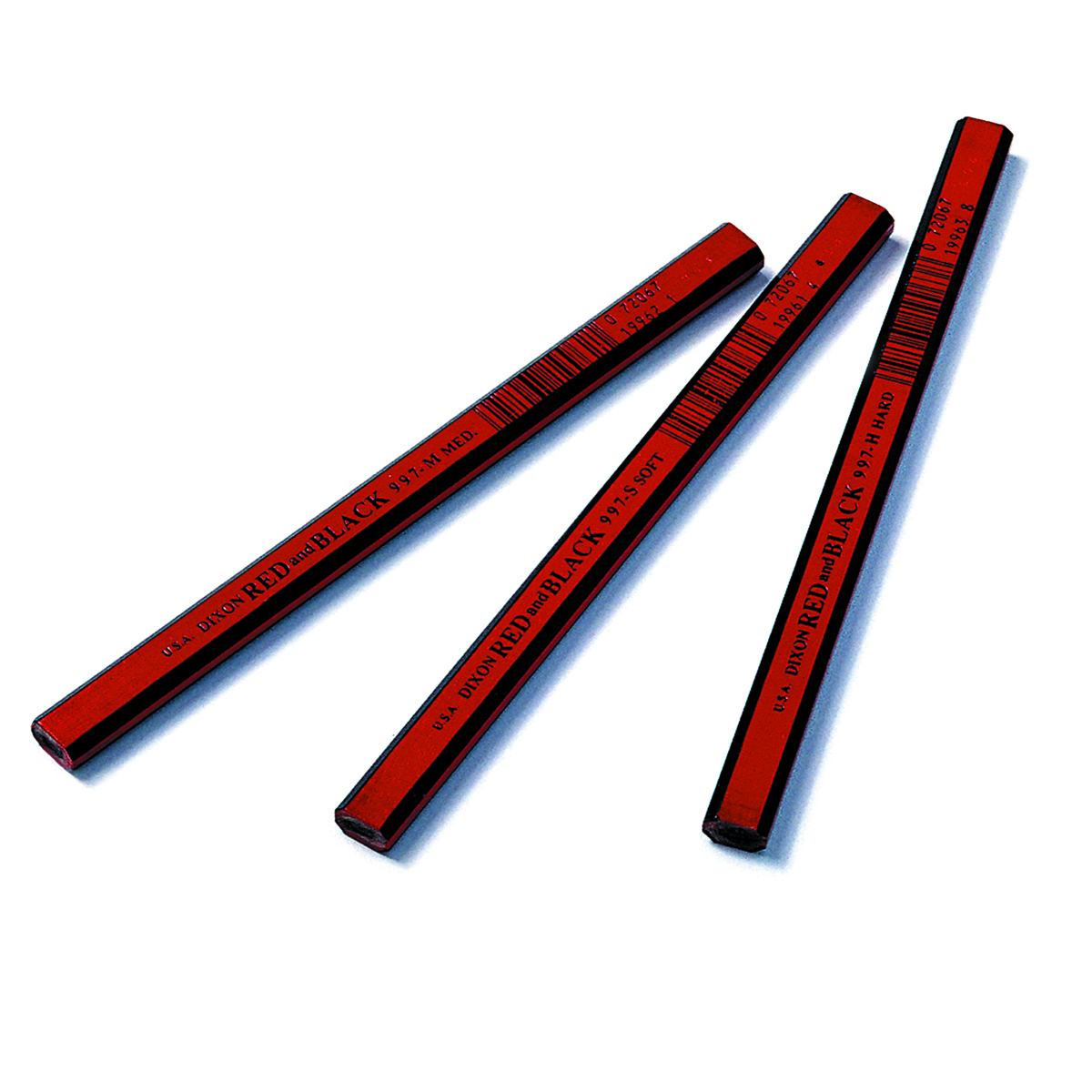 The world's best known carpenter pencil. Flat pencil lays down a long lasting, smooth, rich black mark. Red pencils with black stripes are easy to see and easy to sharpen. Available with Soft, Medium, Hard and Economy Medium graphite core. 12/sleeve. PMA Certified non-toxic.