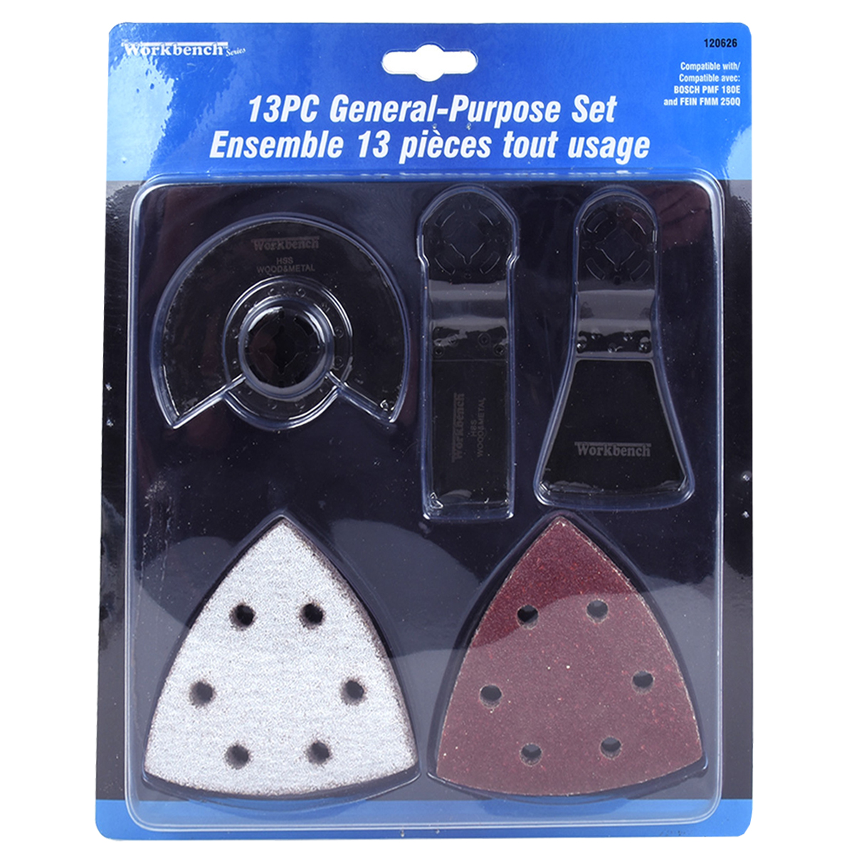 13 pieces general purpose set includes: (1) hss pushcut metal sawblade: 1-1/8in; (1) hss radial sawblade 3-3/8in; (1) hcs (65mn) flexible scraper: 2-1/16in x 1-3/4in; (5) red delta sandpaper for wood: 3-5/8in; (5) white delta sandpaper for wood: 3-5/8in.