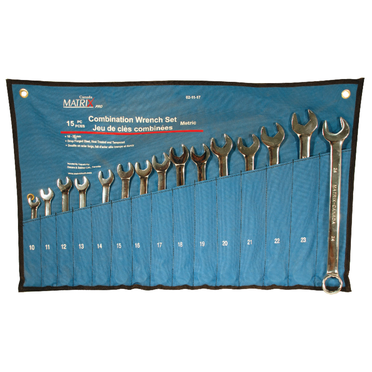 15 piece set included sizes: 10mm; 11mm; 12mm; 13mm; 14mm; 15mm; 16mm; 17mm; 18mm; 19mm; 20mm; 21mm; 22mm; 23mm and 24mm.