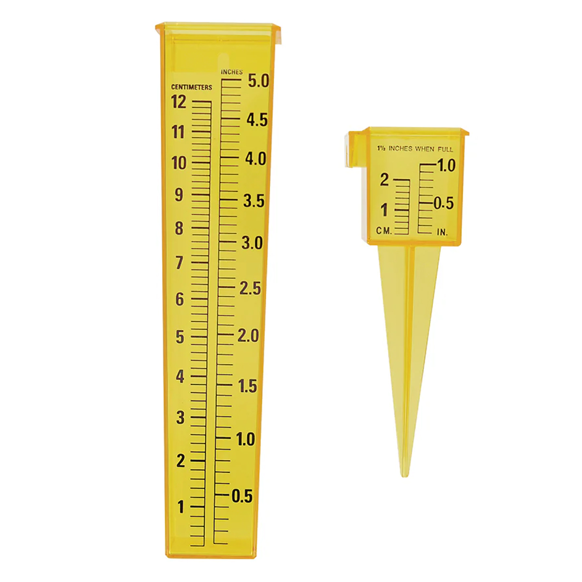 Includes 5” / 120 mm rain gauge and 1” / 2.5 cm gauge for lawn watering.