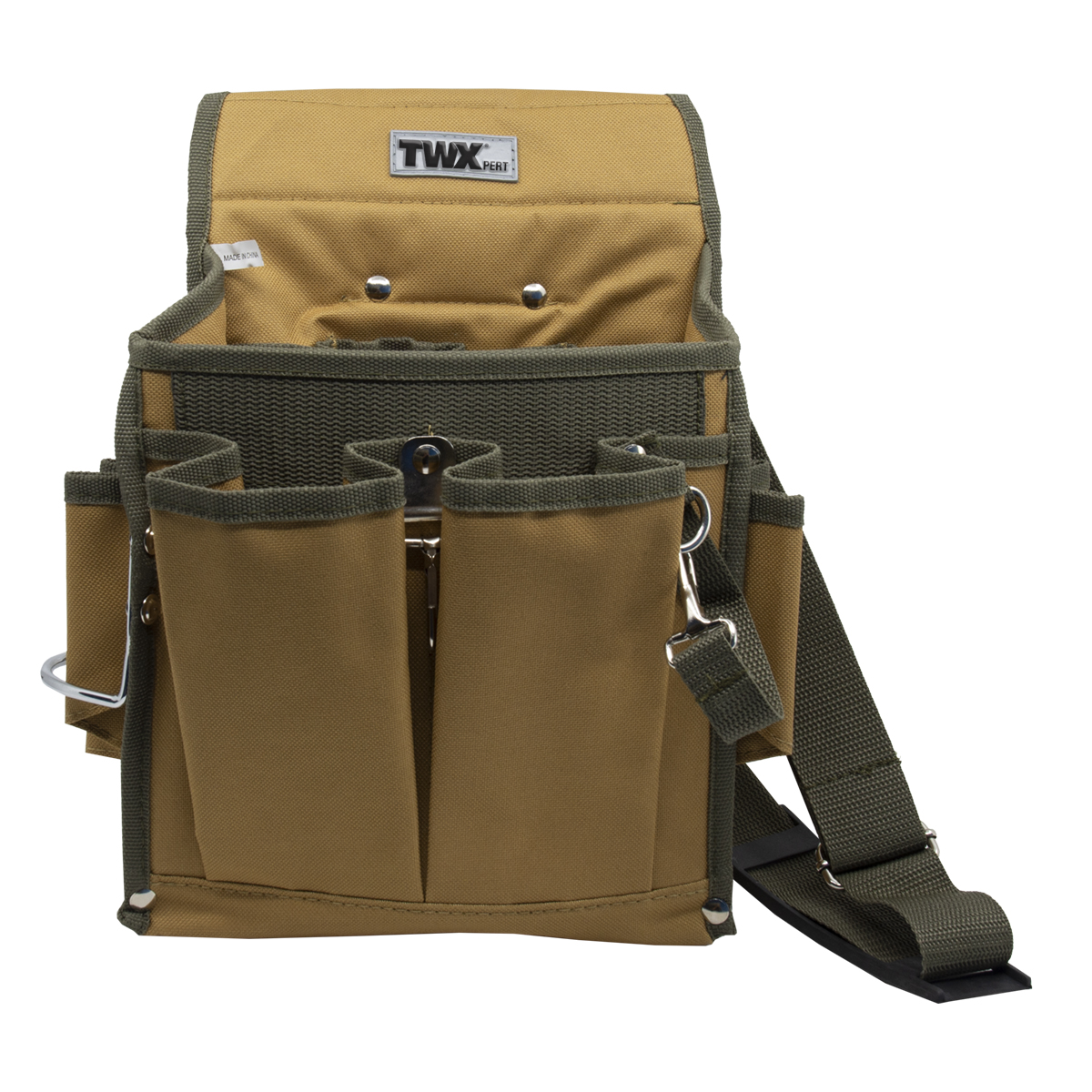 Heavy-duty canvas; padded shoulder strap nylon electrician’s tool pouch.