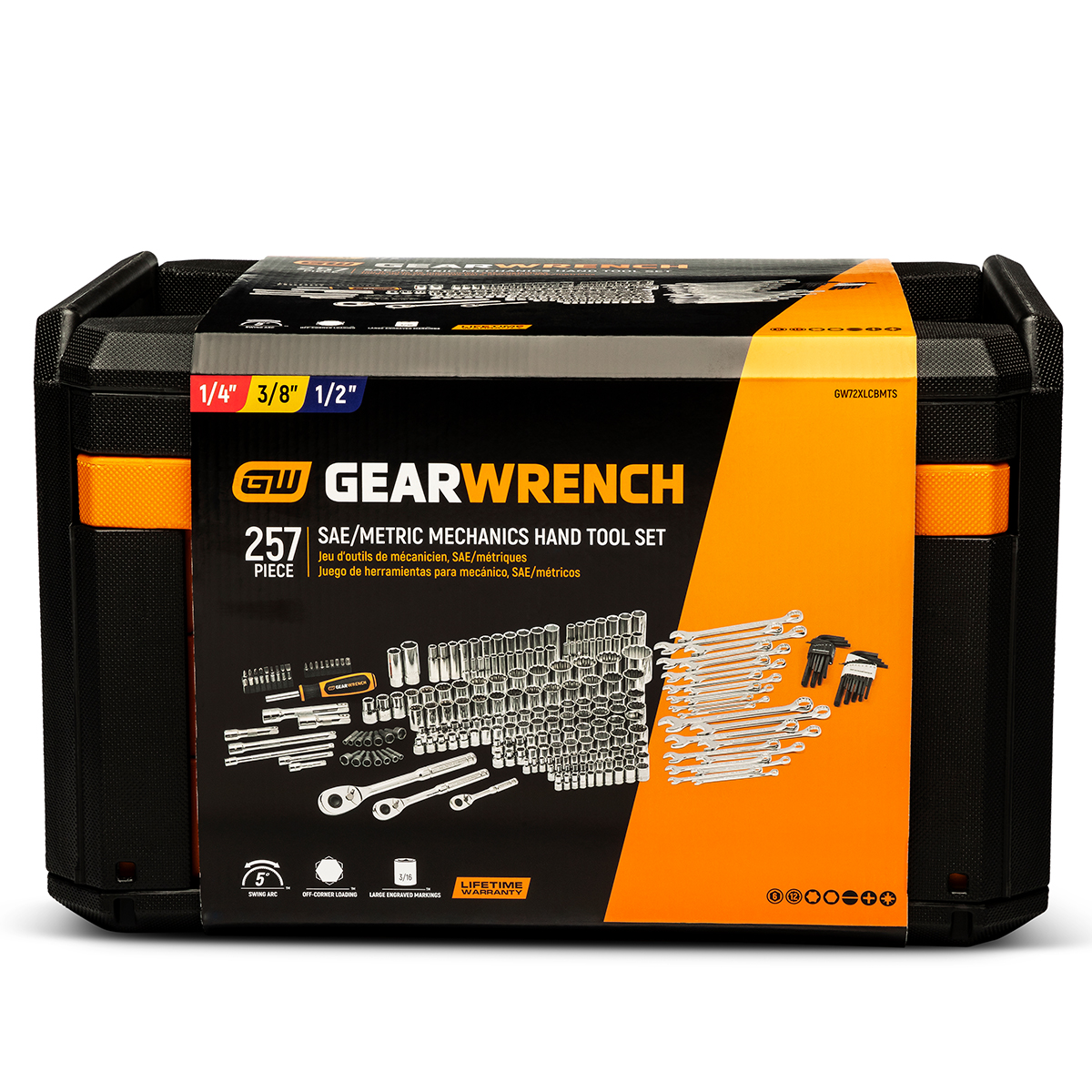 GW72XLCBMTS is a 257 piece 1/4 in; 3/8 in; and 1/2 in drive mechanics tool set that features 6 and 12 point sockets in SAE and metric sizes and in standard and deep lengths.