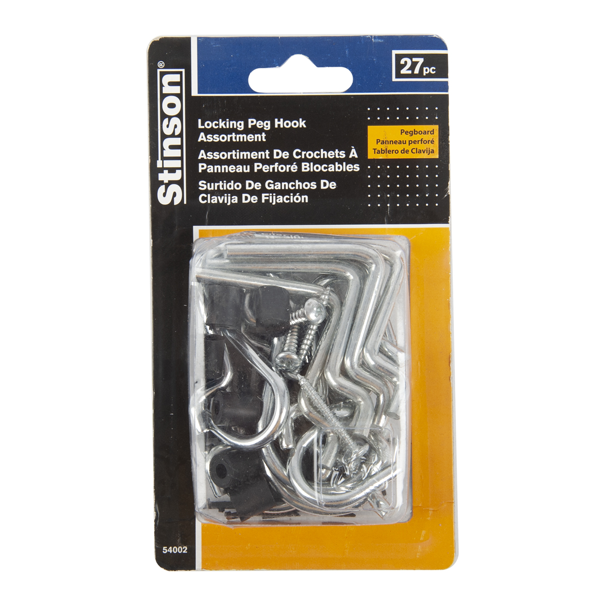The Stinson Storage 27 piece 1/ assorted peg hooks; 6 pegboard mounting screws; 6 mounting spacers; (6) 1-1/2 in straight hooks + peg locks; 6-1/4 in Curved hooks + peg locks.
