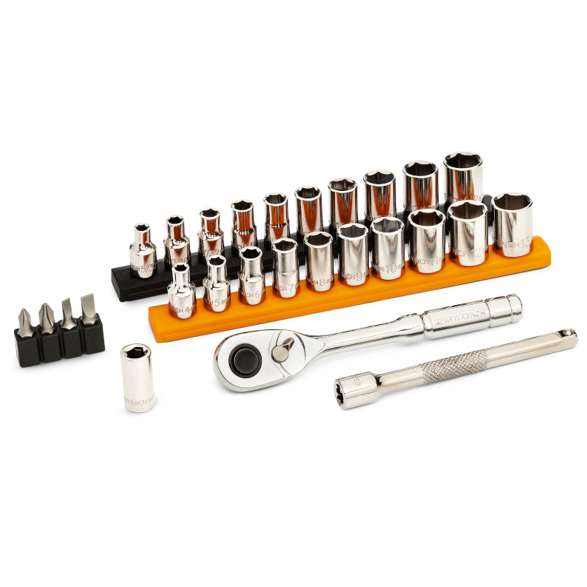34PC Mechanics Hand Tool Set with Stubby Sockets - 1/4in Drive; 72-Tooth 6-Point SAE/Metric