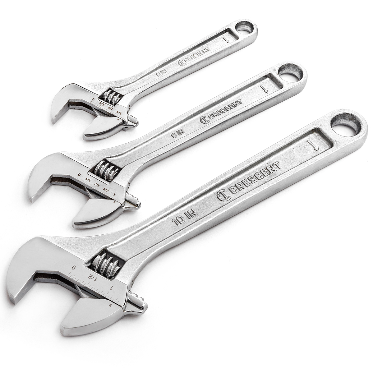 The Crescent® 6-inch; 8-inch; and 10-inch Adjustable Wrenches all feature a large knurl for easy adjustment and a tight jaw fit.