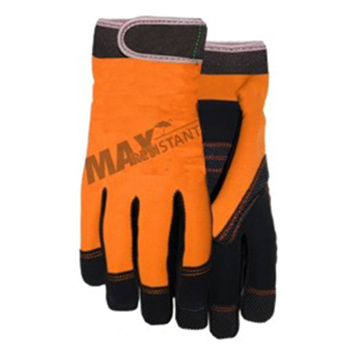 The MAX Resistant™ gloves feature water-repellent technology! The gloves feature a synthetic leather palm with reinforced protective palm patches; a breathable spandex back and Velcro® wrist closure.
