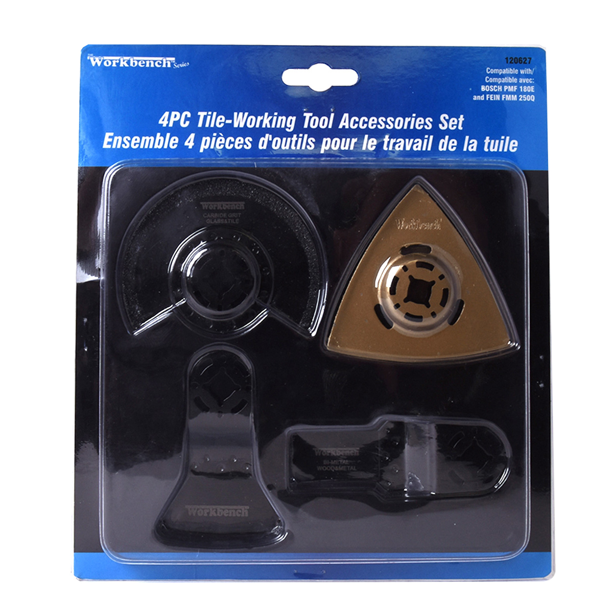 4 pieces tile-working tool accessories set contains: (1) Bi-metal Pushcut sawblade: 7/8in x 1-7/16in, (1) HCS (65Mn) rigid scraper: 2-1/16in x 1in, (1) Carbide grit Radial sawblade: 3-3/8in, (1) carbide grit Delta rasp: 3-1/8in.