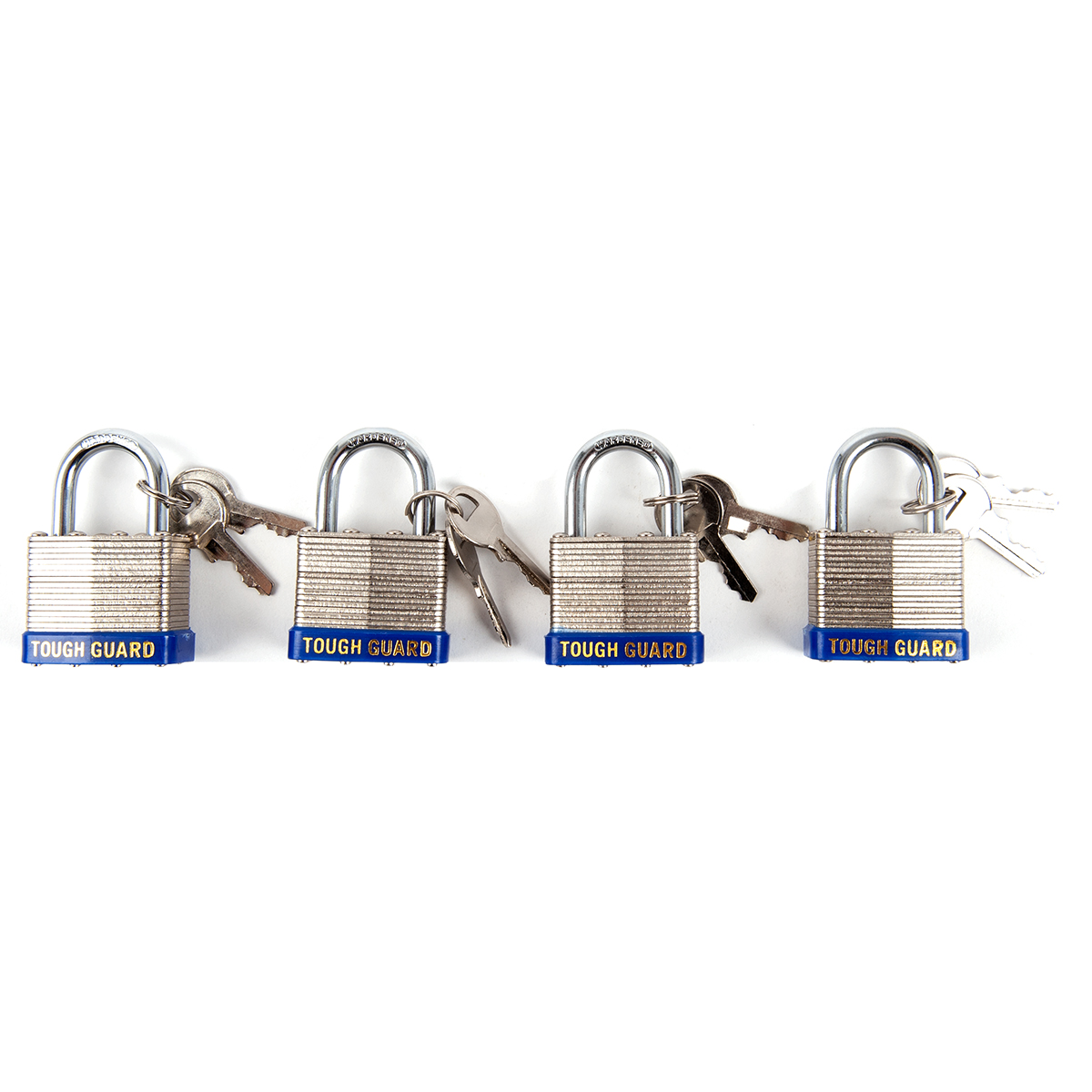 Laminated steel The Tough Guard 4 piece padlock laminated 40mm key alike; made of laminated steel.