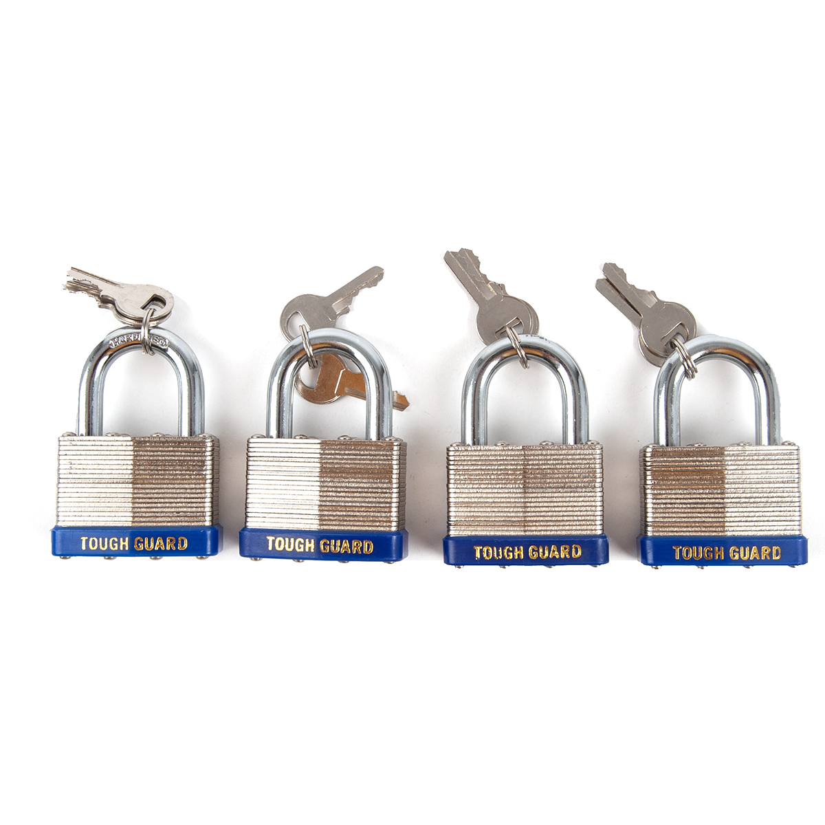 Laminated steel The Tough Guard 4 piece padlock laminated 50mm key alike; made of laminated steel.