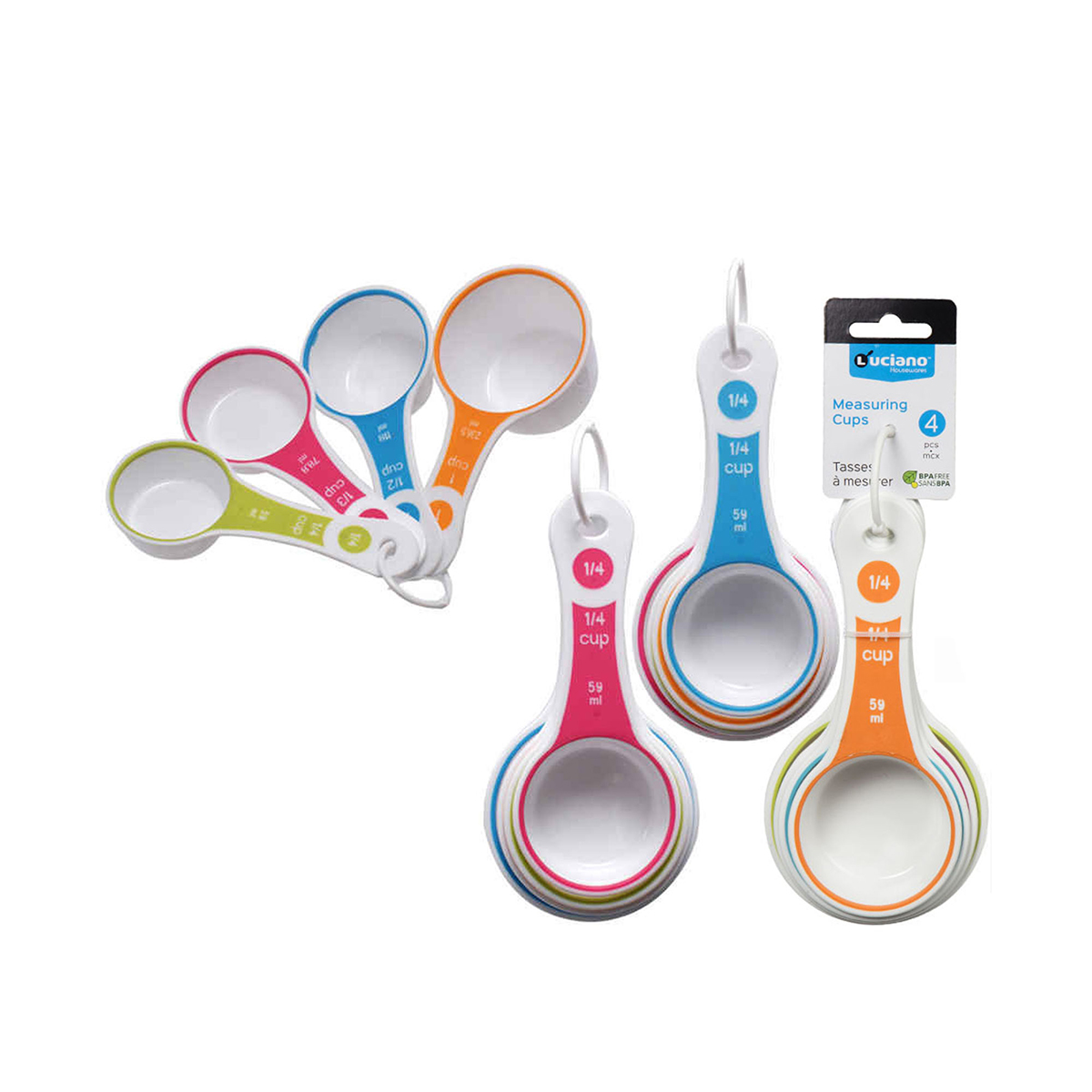 Bpa free measure cup 4-piece set includes standard kitchen measurements; from 1/4 cup and up.