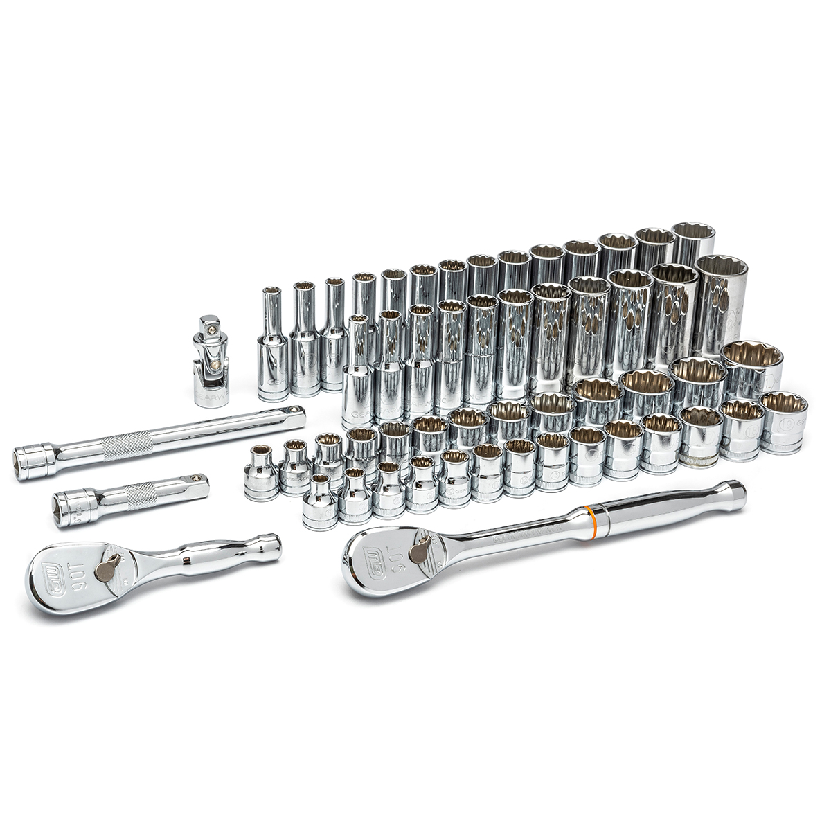 The 90 tooth ratchets and sockets are made from premium alloy steel and feature a full polish chrome finish that resists rust and corrosion.