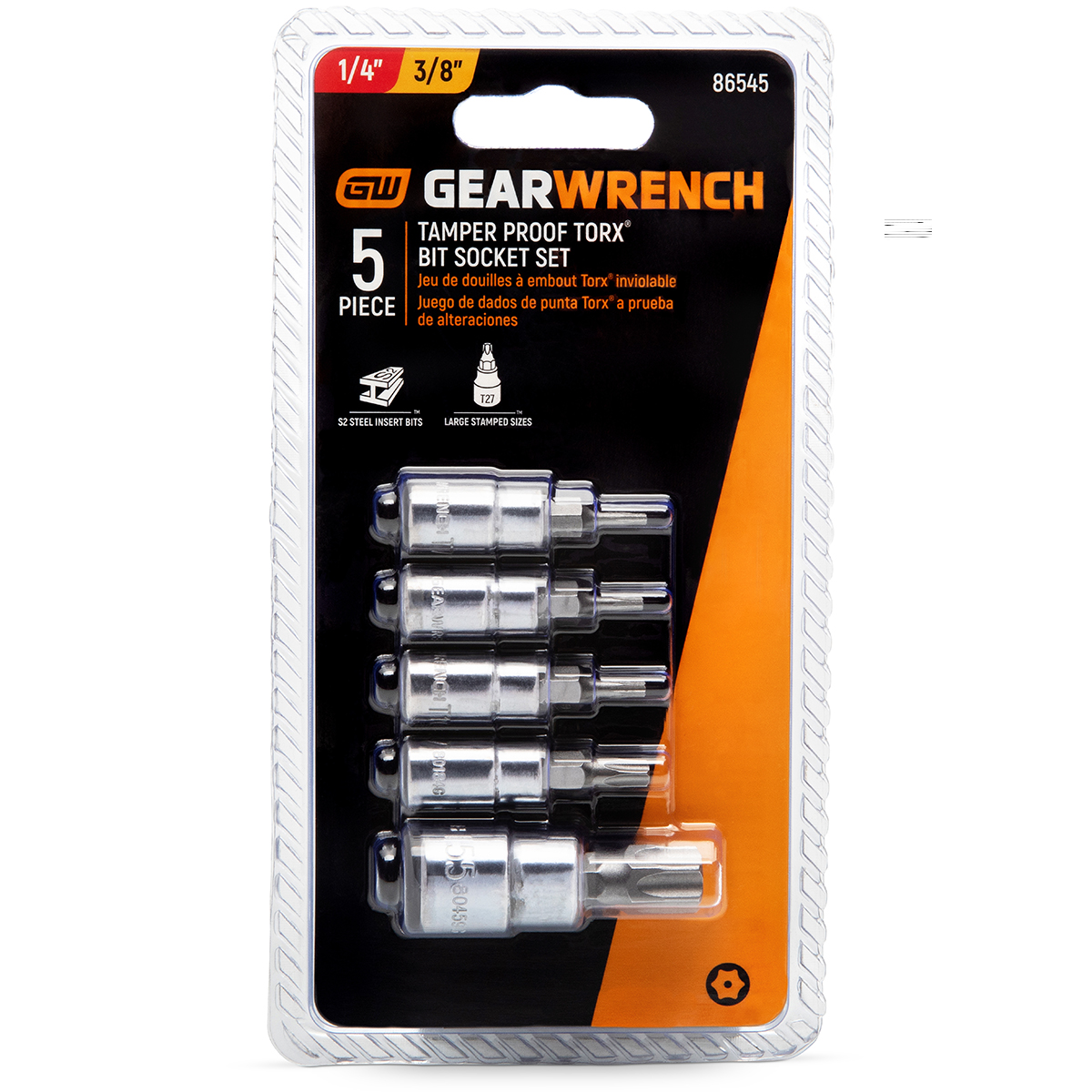 The GEARWRENCH 86545 5pc 1/4in & 3/8in Drive Tamper-Proof Torx Bit Socket Set is designed for precision and durability; making it ideal for removing tamper-resistant fasteners.