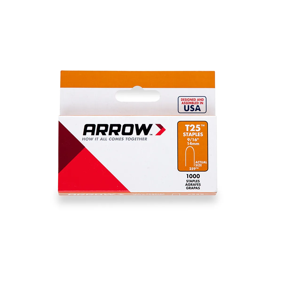 T25 staples feature a round crown design that secures wires without damaging them. The leading choice for low voltage wire applications; the T25 staple is an absolute boss when installing garage door openers; thermostat wire; doorbell wire; alarm systems; and much more. Also works great on computer; CAT5/CAT6. RG6/RG9; COAX and phone cables. All Arrow T25 staples are made under strict quality controls.
