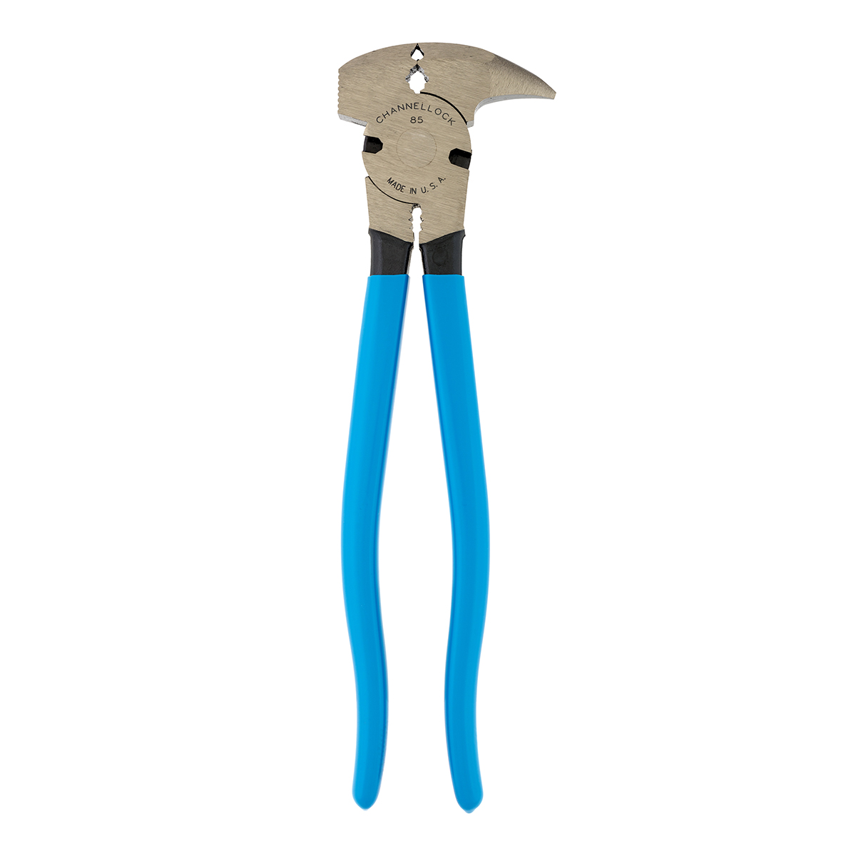 For use on metal or wood posts. Hammer head is on 1 jaw; corrugated starting and pulling point on the other. Heavy lock-joint construction with oval faced jaws. Ideal for staple pulling and lug lifting; and wire stretching. Wire cutter on each side will cut double strand barbed wire. Highly polished head; knurled-grip; blue plastic handles.