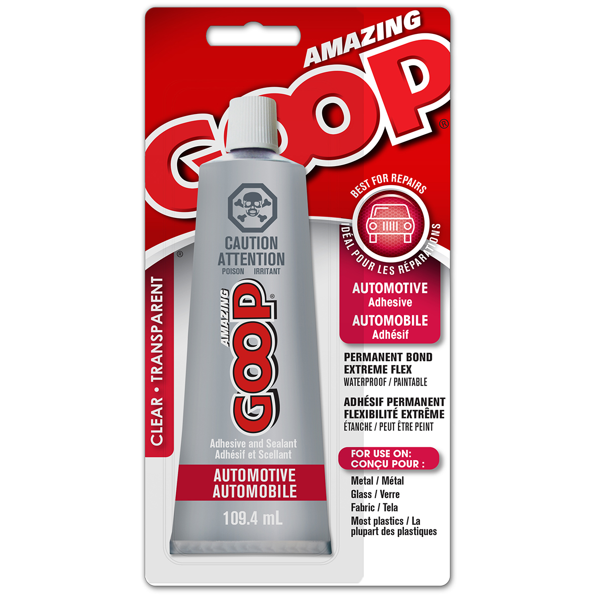 Amazing GOOP Automotive will repair; seal and stick to a wide variety of materials. Its versatility makes it ideal for all kinds of automotive needs: everything from repairing upholstery to coating battery terminals to attaching loose trim! Bonds easily to a wide variety of materials; including metal; glass; vinyl and leather.