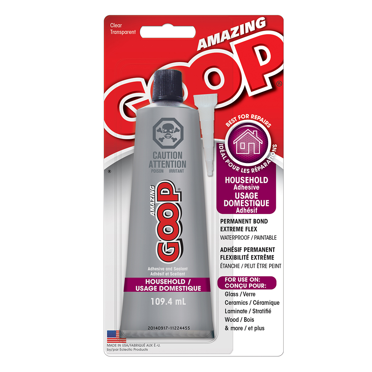 Amazing GOOP Household is the only adhesive you'll need for home repairs because it repairs; seals and sticks to virtually anything. Its strength is superior to any other brand out there. Use on everything from glass to wood to vinyl to brick!