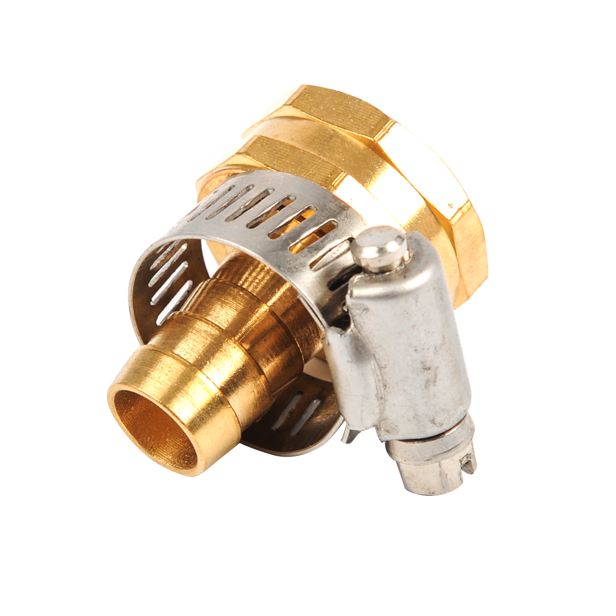 Brass garden hose mender 5/8in female w/ ss clamp.