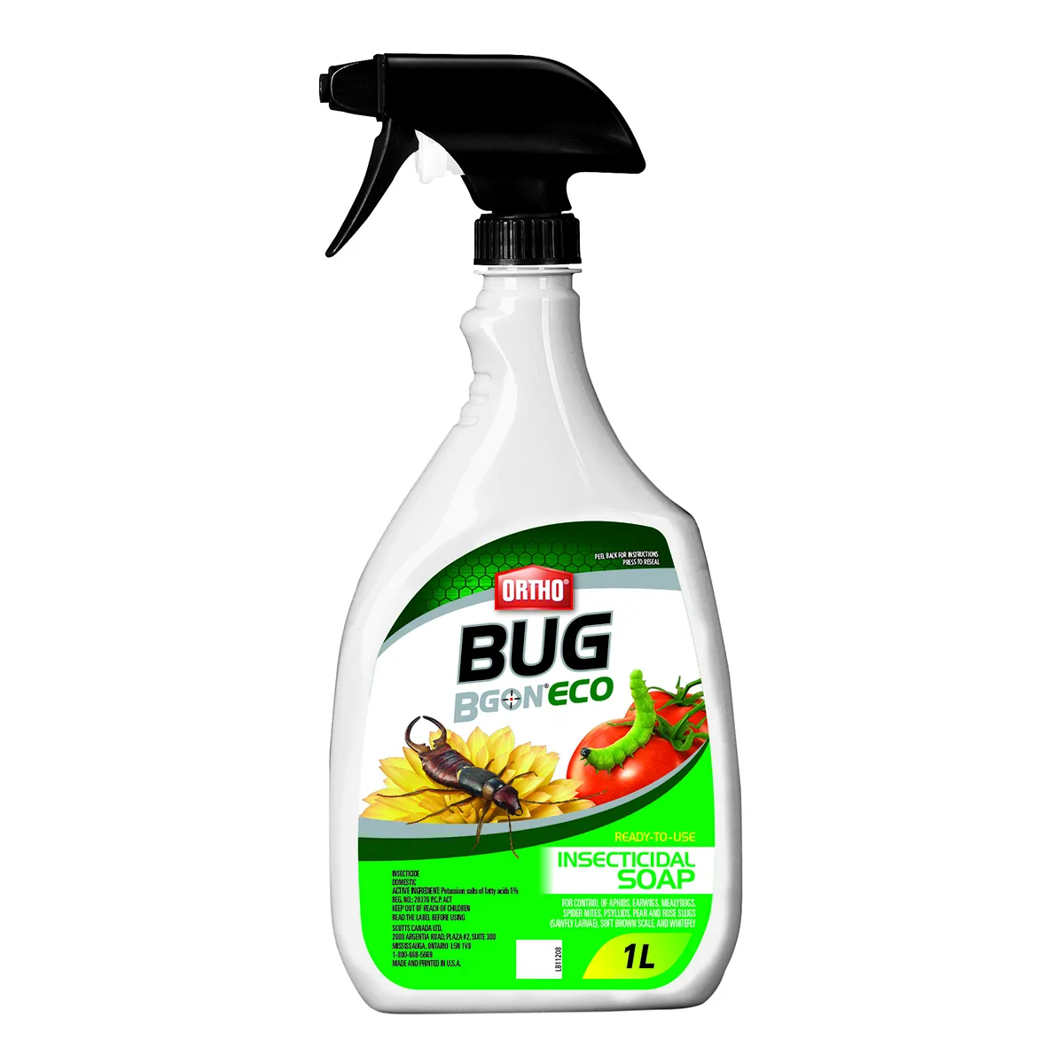 Primary Ingredient: Potassium salts of fatty acids 1% Ortho® Bug B Gon® ECO insecticidal soap ready-to-use is an effective way to end bug problems in the garden and on house plants. The formula controls pests on contact to prevent damage to your plants. Simply spray to saturate insects on plants to eliminate many common pests such as aphids; earwigs; spider mites and more. This convenient ready-to-use format is ideal for houseplants and smaller pest control tasks in the garden. This spray can be used on a variety of plants from ornamentals to fruit trees; plus it can be applied to edible produce up to the day you harvest.