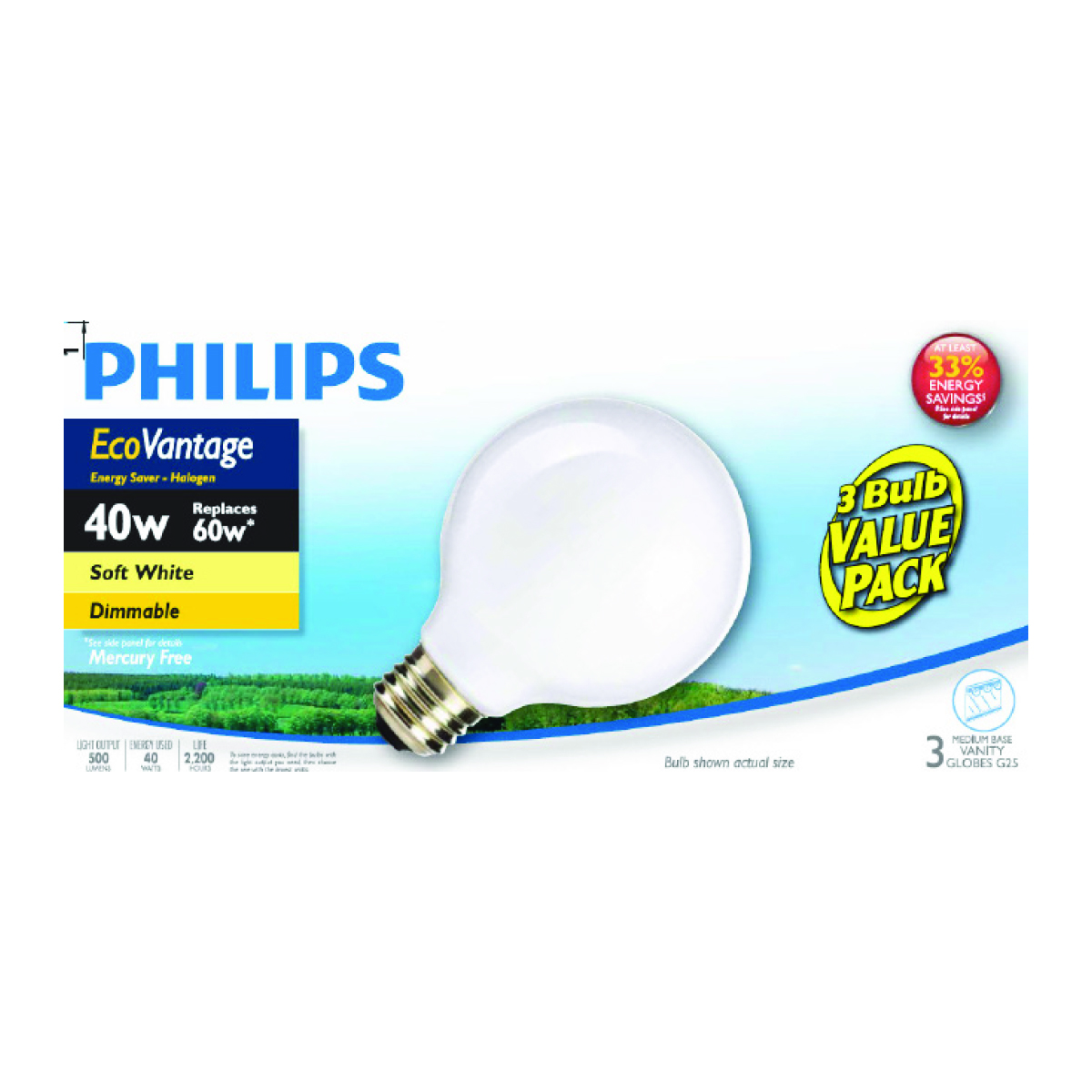 Energy-efficient replacement for 65w halogen globe (g25) 40w = 65w 3 pack.