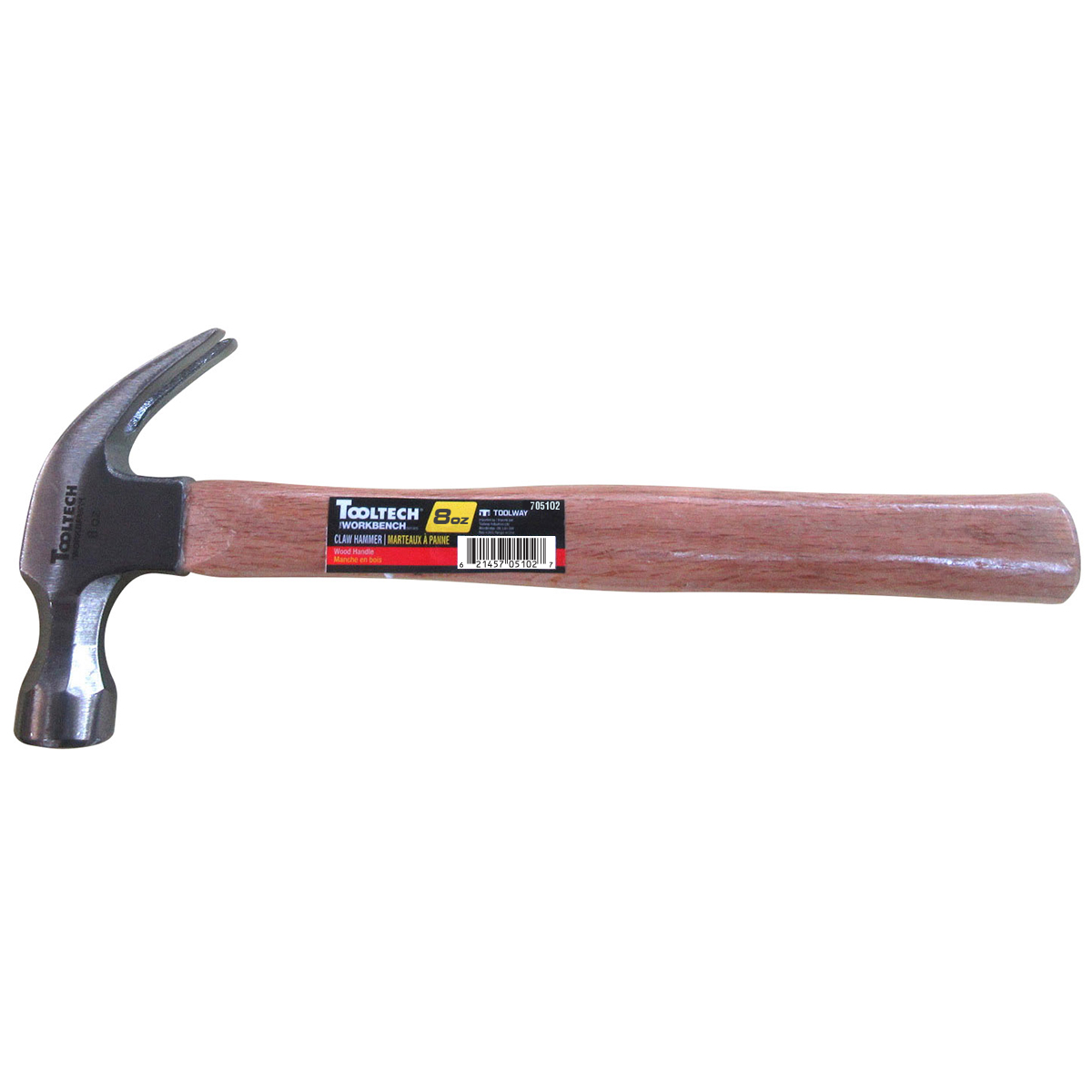 The Tooltech Workbench claw hammer 8 oz wooden handle; steel head.