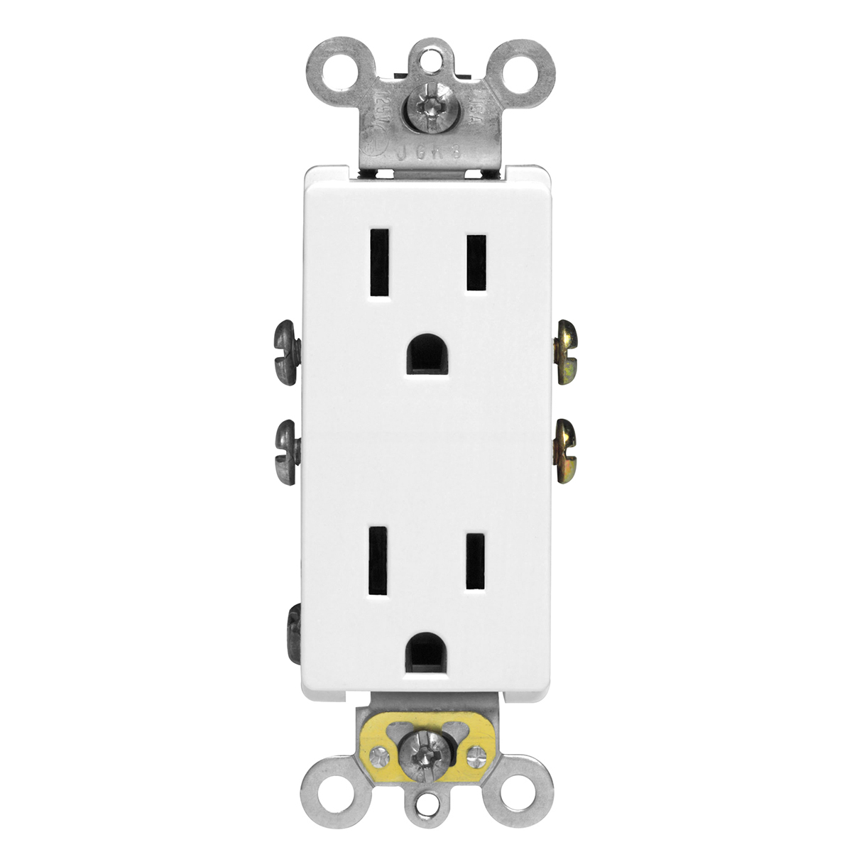15 amp; 125 volt; NEMA 5-15R; 2-pole; 3-wire; decora duplex receptacle; straight blade; residential grade; grounding; quickwire push-In & side wired; steel strap.