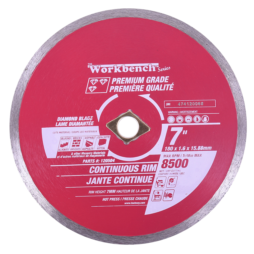 Continuous Rim diamond saw blades and are perfect for fast cuts in Brick; Block; Granite; Porcelain; Concrete.For Wet Cutting;Max RPM: 8500.