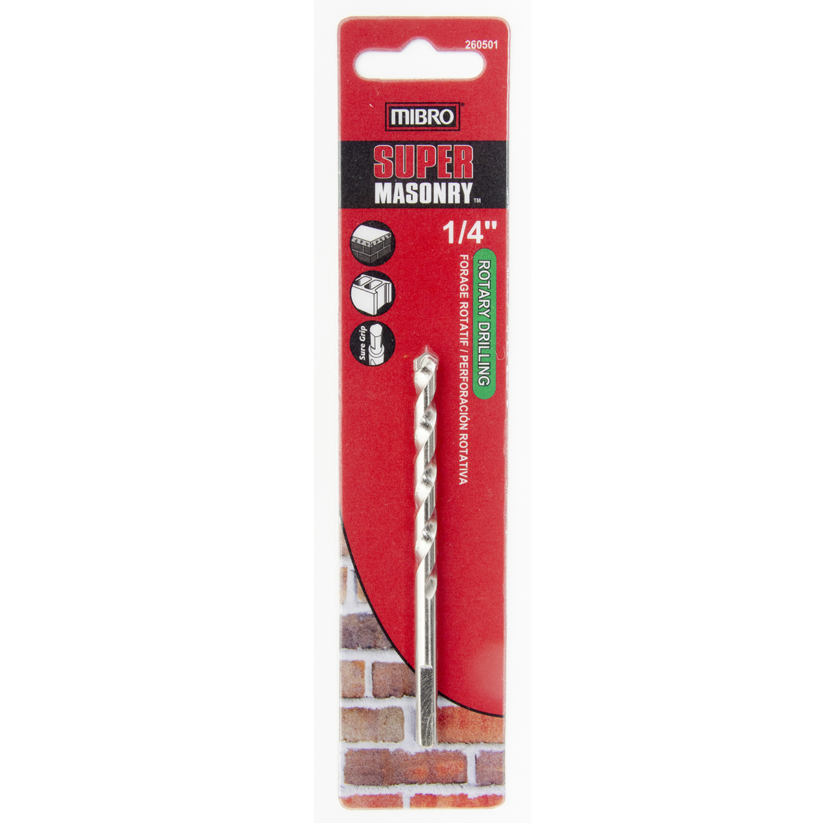 Rotary drilling. Positive angle tip geometry. Premium brazing material adheres carbide tip to the drill bit body for maximum durability. Slow spiral flute design ensures efficient material removal allowing the bit to run cooler and extending service life. Long sizes are 13in (330.2mm) versus 12in (304.8mm); allowing bit to fully clear a cinder block. Not recommended for drilling into glass and ceramics.