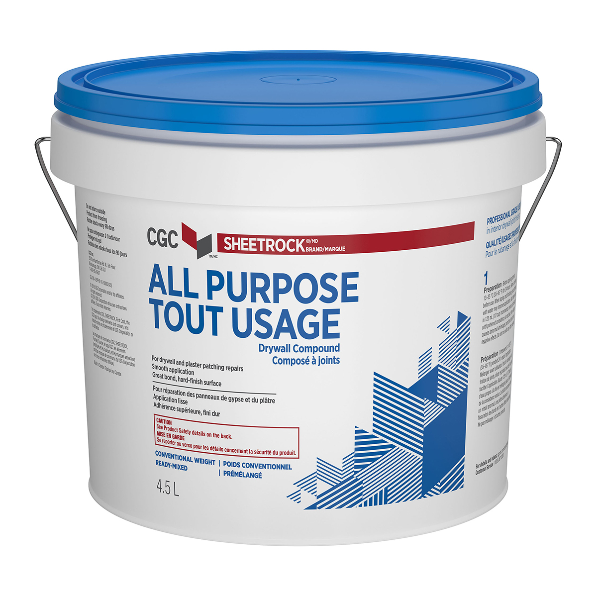 CGC Sheetrock® Brand All Purpose Drywall Compound is an excellent compound for joint finishing (taping; filling and finishing). It's ready-mixed formulation is creamy and smooth; giving it excellent slip; bond strength and easy workability. It can be used directly from the container and requires minimal mixing and/or thinning. CGC Sheetrock® Brand All Purpose Drywall Compound can also be used for fasteners; bead; trim and skim coating.