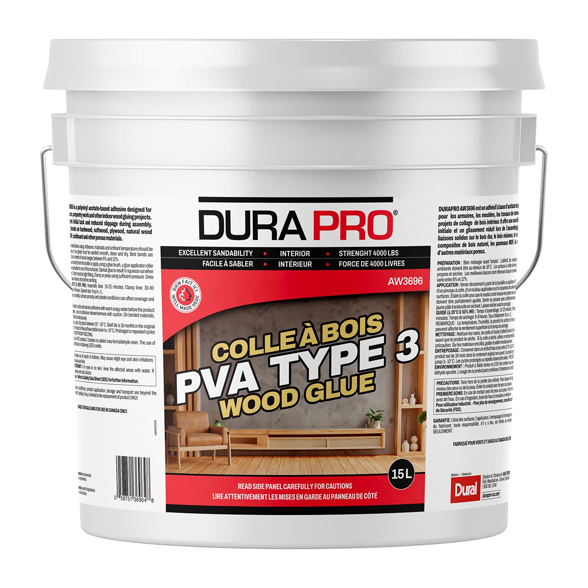 DURAPRO AW3696 is a polyvinyl acetate based adhesive designed for cabinets; furniture; carpentry work and other indoor wood gluing projects. It has an excellent initial grip and reduced slip during assembly. Forms strong bonds on hardwood; softwood; plywood; natural wood composites; MDF; cardboard and other porous materials.