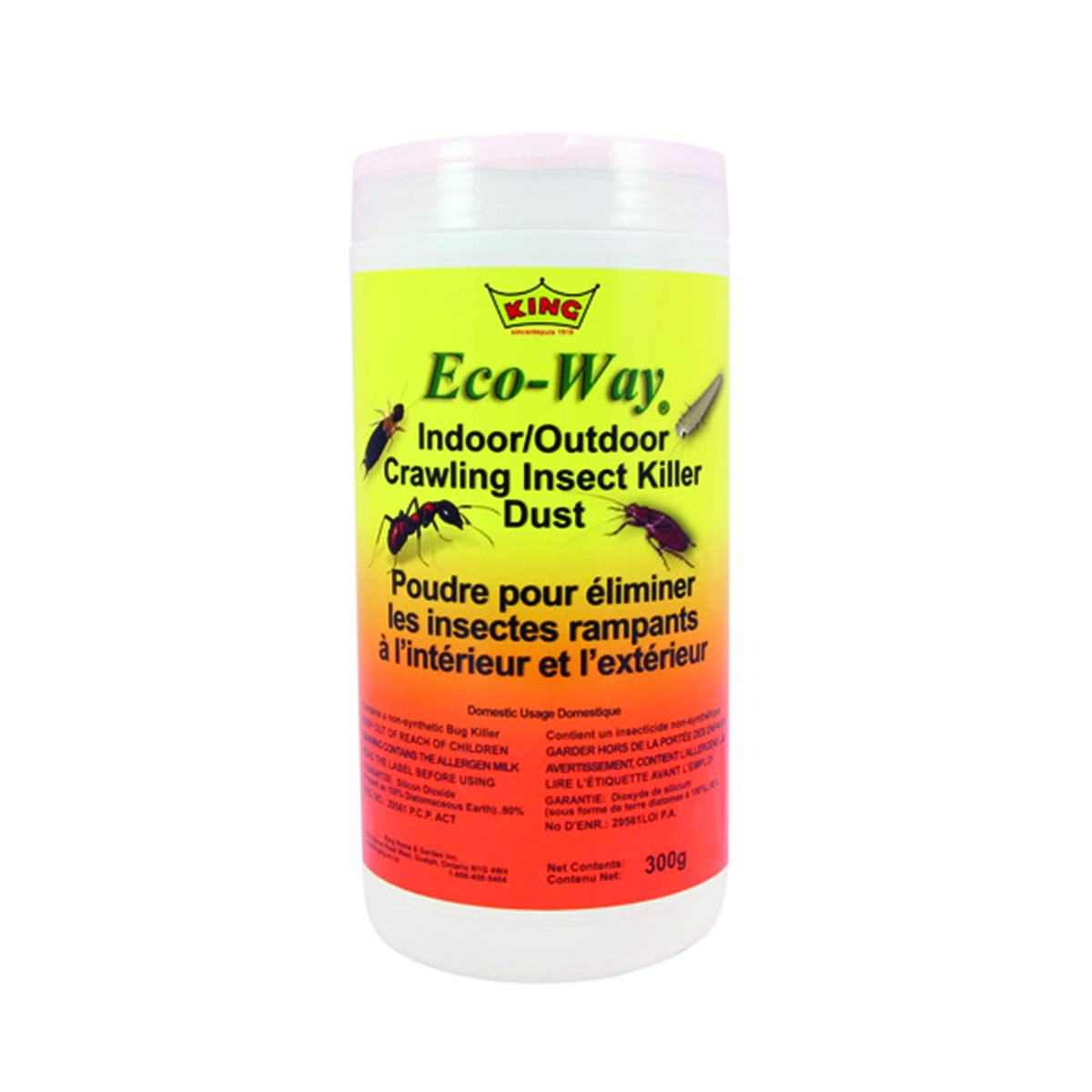 Canadian made; the Eco-Way® indoor/outdoor crawling insect killer dust comes in a shaker bottle for easy dispensing. This product can be used for ants; earwigs; cockroaches; fleas; silverfish; crickets; millipedes; centipedes and bedbugs. It contains two food grade attractants which draws bugs to the powder. This powder contains silicon dioxide; which kills by mechanical action both externally and internally when insects ingest it. Insects do not develop a resistance to this dust.
