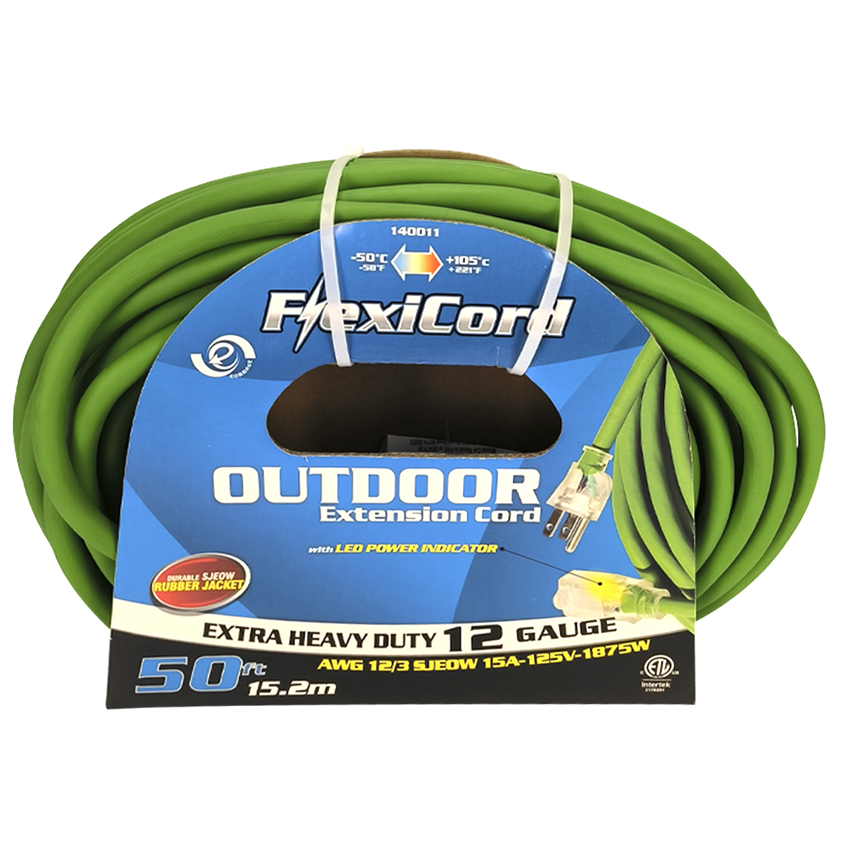 Ultraflex outdoor extension cords by Toolway are perfect for all job sites and working conditions. These heavy duty cords are designed with a durable high-visibility green rubber jacket; allowing them to remain flexible and prevent cracking in arctic cold or melt in desert heat. They are rated to 125V and are equipped with led power indicator ends; which allows you to see if there is power going through them from a distance. These cords are also water; ozone and oil resistant. Applications: chain saws; wet/dry vacs; orbital sanders; outdoor equipment.