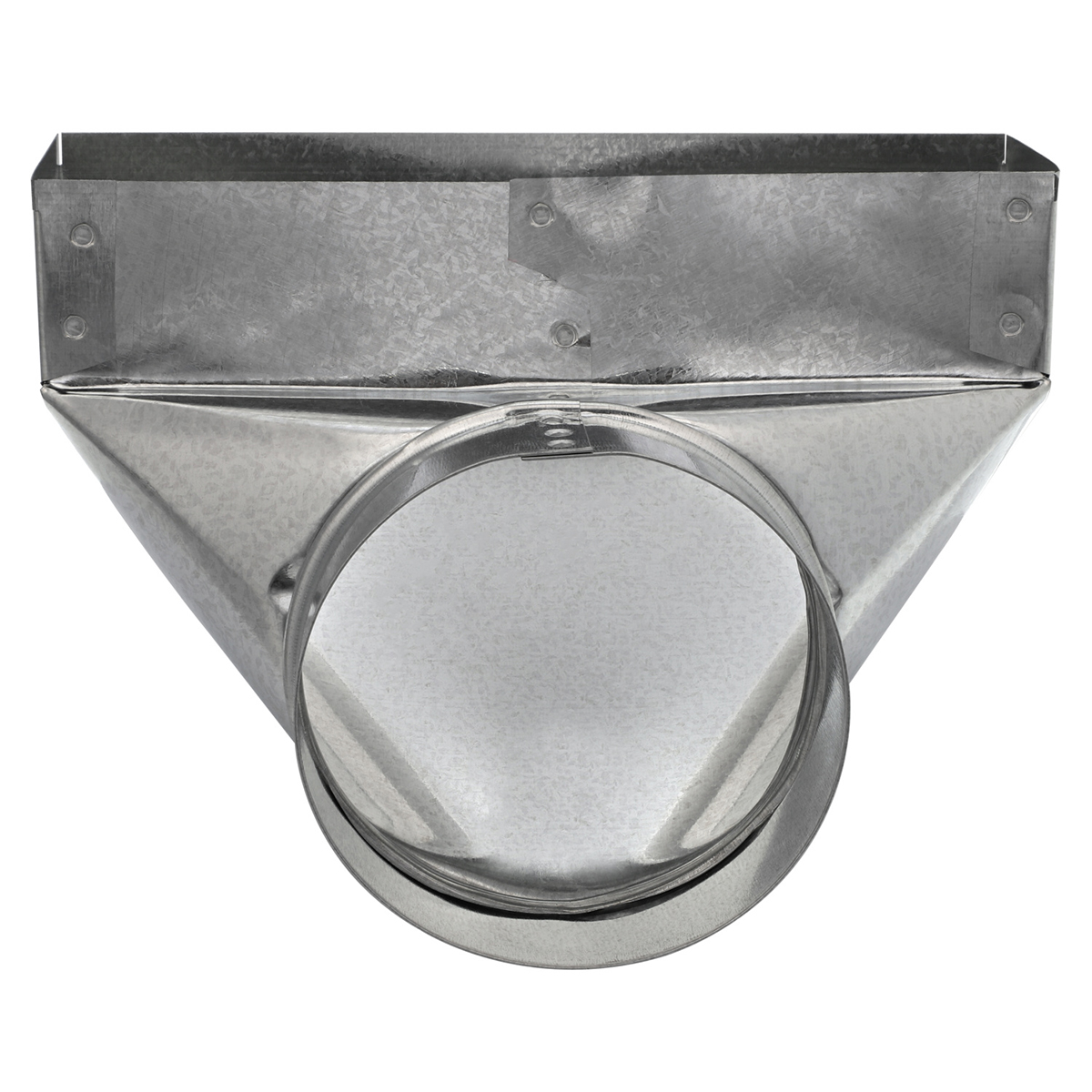 Used for right-angle transition from round pipe or insulated flexible duct to a register or grille.