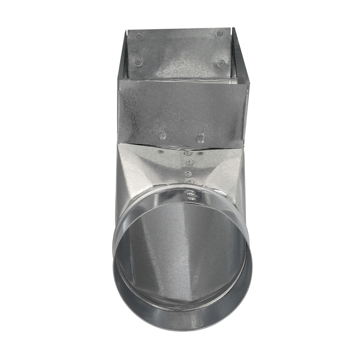 Used for right-angle center-end transition from round pipe or insulated flexible duct to a register or grille.