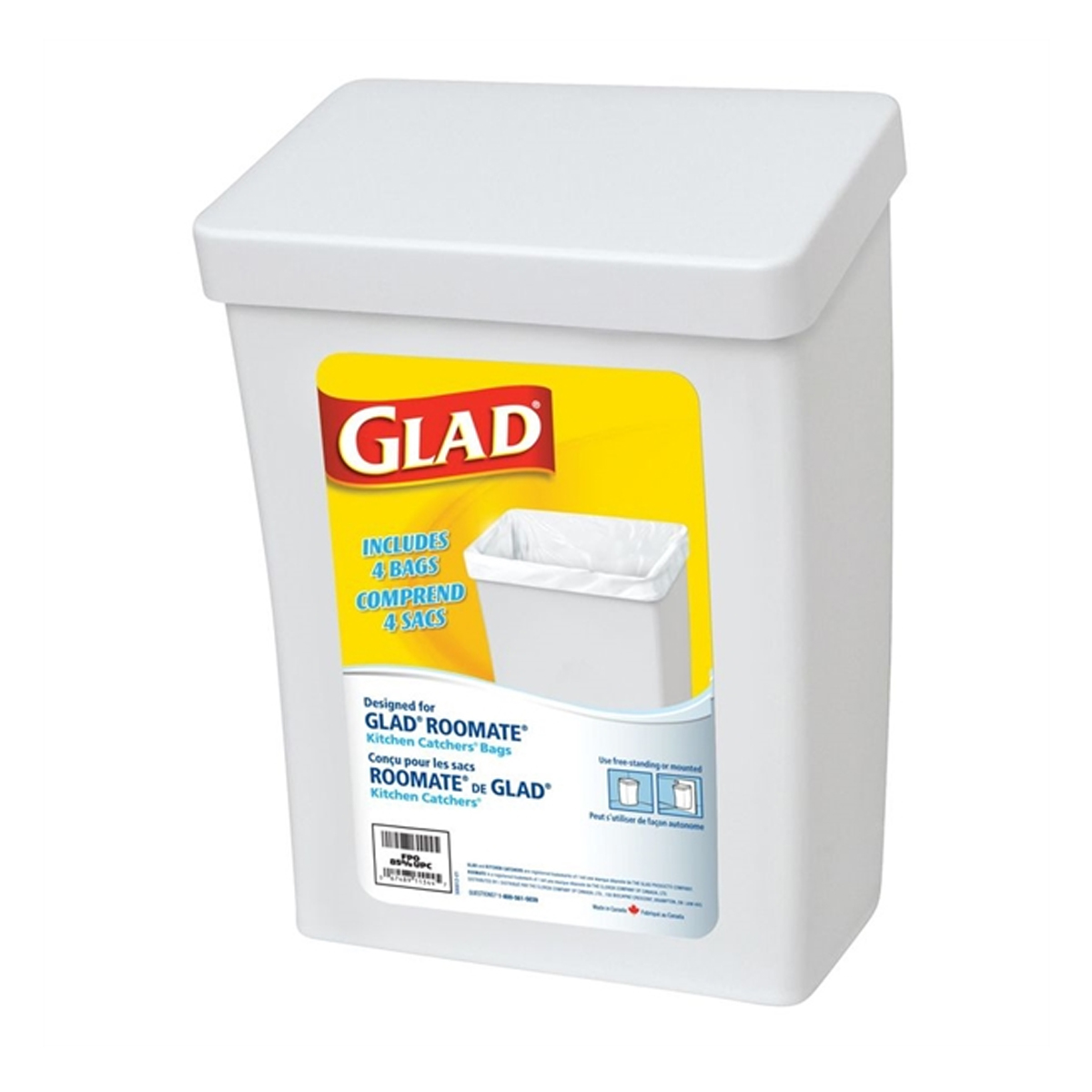 Glad Roomate garbage container is a small waste container perfect for use in your home; kitchen, office, bedroom or bathroom. The bin fits GLAD white extra small garbage bags. Neat out-of-sight way of disposing of kitchen garbage Saves space and can be mounted to a cupboard door or used free.