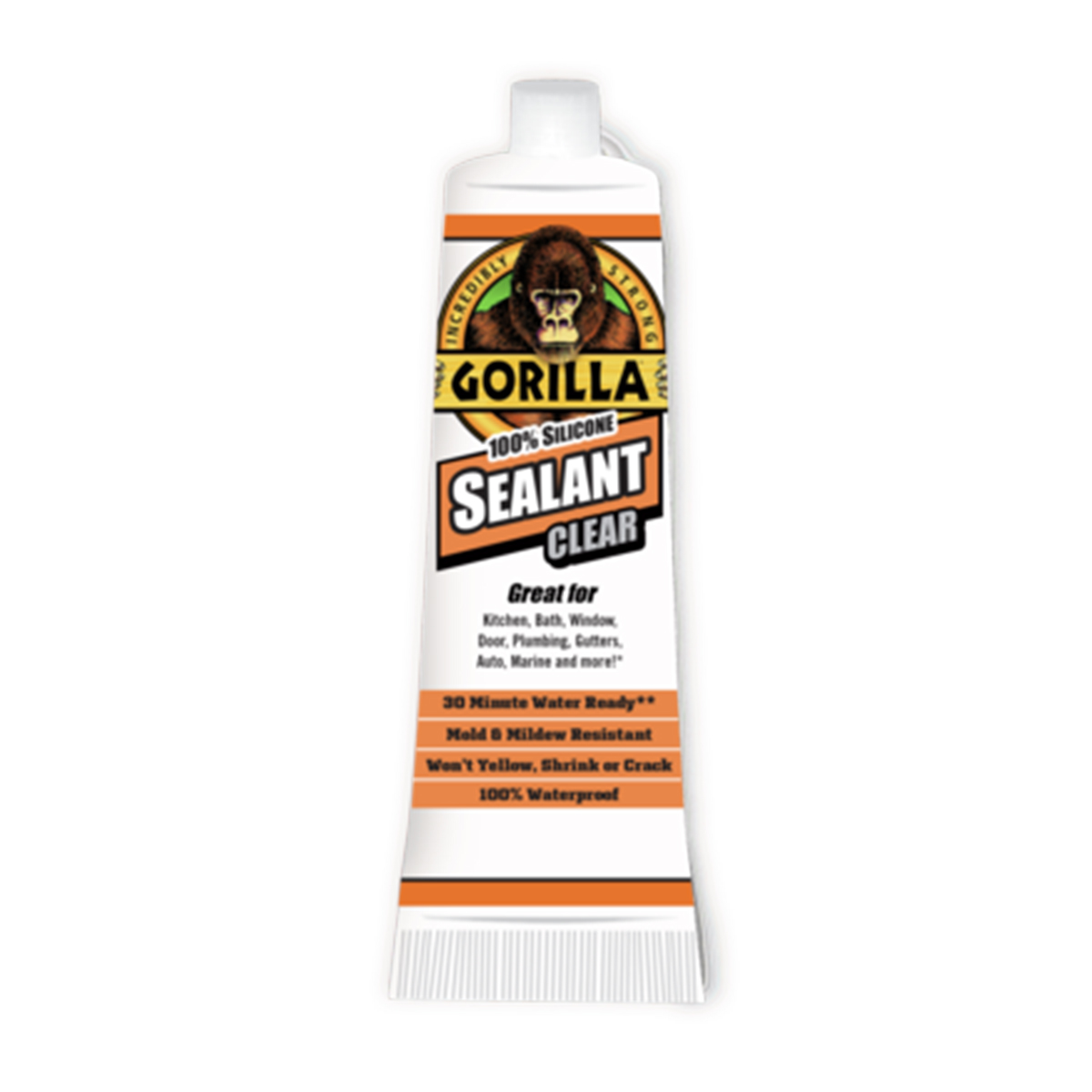 Gorilla silicone sealant is great for the kitchen; bath; window; doors; auto; marine plumbing; gutters and more! Ready for water exposure in just 30 minutes; this waterproof sealant is mould and mildew resistant. The clear silicone sealant won't yellow; shrink or crack over time.