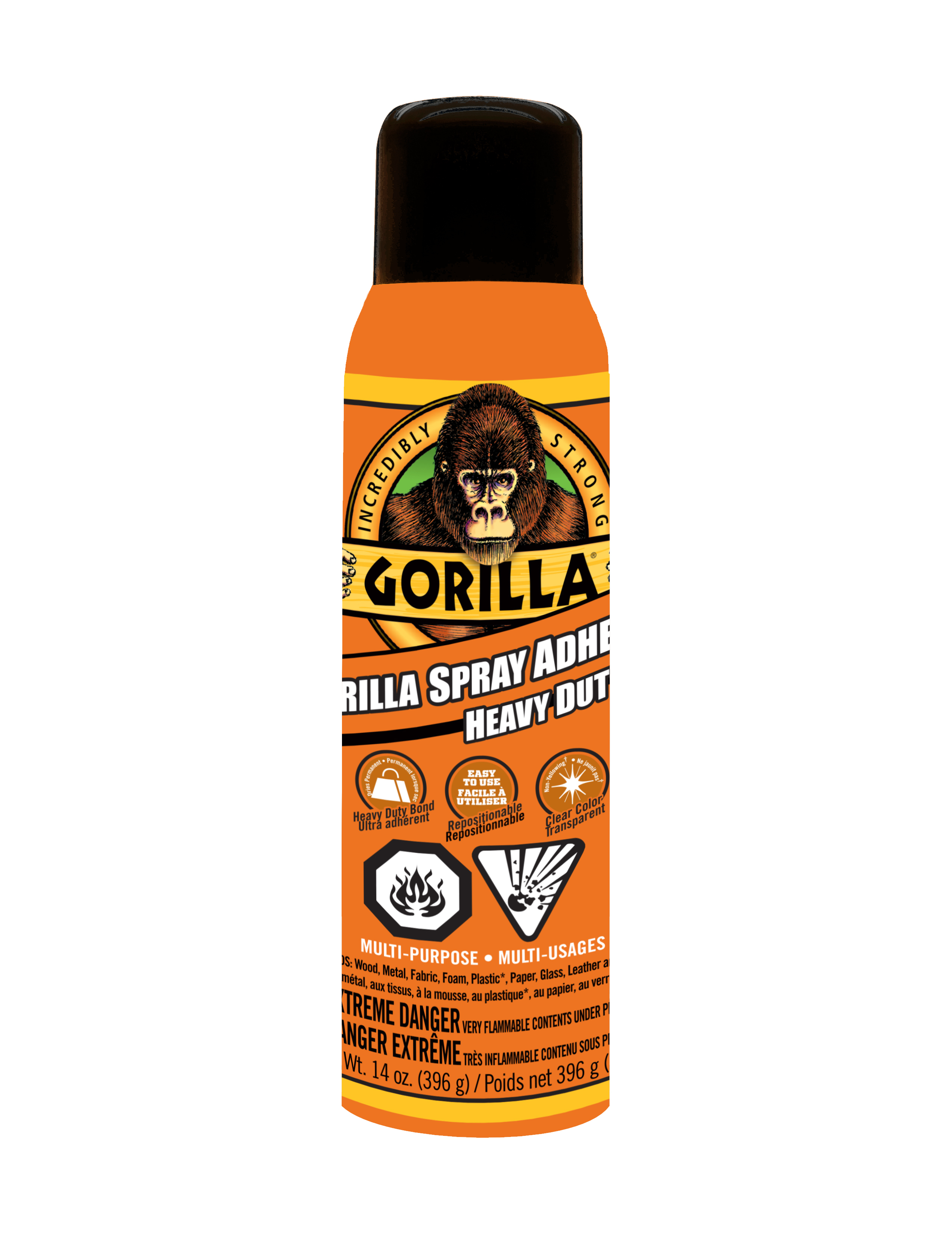 Gorilla spray adhesive is heavy duty; multi-purpose and easy to use. It forms a clear; permanent bond that is moisture resistant and can be used on projects both indoors and out. This spray adhesive is also photo safe. Its wide pad nozzle and controlled; fine mist spray provide an even application on the project you are working on. All surfaces should be clean and free of dirt; grease and oil. Protect surrounding areas from overspray to avoid residual adhesive.