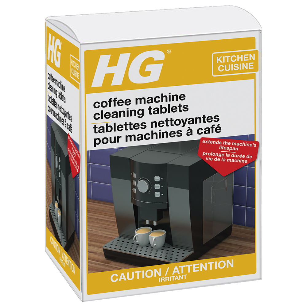 Grinding coffee beans and making coffee under pressure produces deposits of coffee residue and oils in the internal system and valves of automatic coffee machines. HG coffee machine cleaning tablets guarantee a lasting; optimum coffee flavour; and are essential to extending your machine's life and preventing faults. HG coffee machine cleaning tablets have been tested/found suitable for automatic espresso coffee machines of brands like Siemens; Bauknecht; Illy; DeJongh; Philips; Bosch; Krups; Saeco; Kenwood and AEG. HG coffee machine cleaning tablets are also suitable for cleaning the pod holder and the coffee outlet part of the pod-coffee machine or the piston holder of espresso machines. Directions for use: We recommend that you clean the coffee machine after about 100 to 150 cups; or once every 2 weeks. For cleaning your coffee machine most effectively; follow the instructions of the cleaning programme as described in the instructions for use of your fully automatic coffee machine. For Pod-Style machines; put the pod holder; outlet part or piston holder into a tray with approximately 500 ml of hot water; and make sure the parts are completely submerged. Add 1 HG coffee machine cleaning tablet and allow to soak for 30 minutes. Then brush and rinse thoroughly.