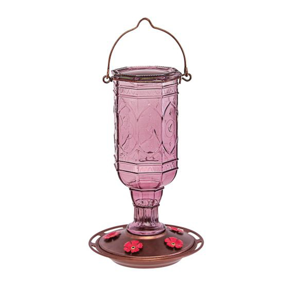 Hummingbirds are nature’s gems; so attract more hummingbirds to bedeck your backyard with a More Birds® Red Jewel Hummingbird Feeder! This stunningly red; vintage 8-sided glass bottle design features elegant hummingbird motifs that add a splash of bygone beauty to your backyard. With polished copper accents; the Red Jewel is built with a durable metal basin cap that includes 5 metal flower feeding ports in polished red. The wide opening and flat bottle make it easy to fill; and the feeder disassembles into three pieces for convenient cleaning. The Red Jewel features a metal perch ring that provides hummingbirds a place to rest while feeding. A built-in hanger is included for easy hanging. With a 20 oz. nectar capacity; the Red Jewel provides plenty of nectar to keep hummingbirds happy and coming back for more!
