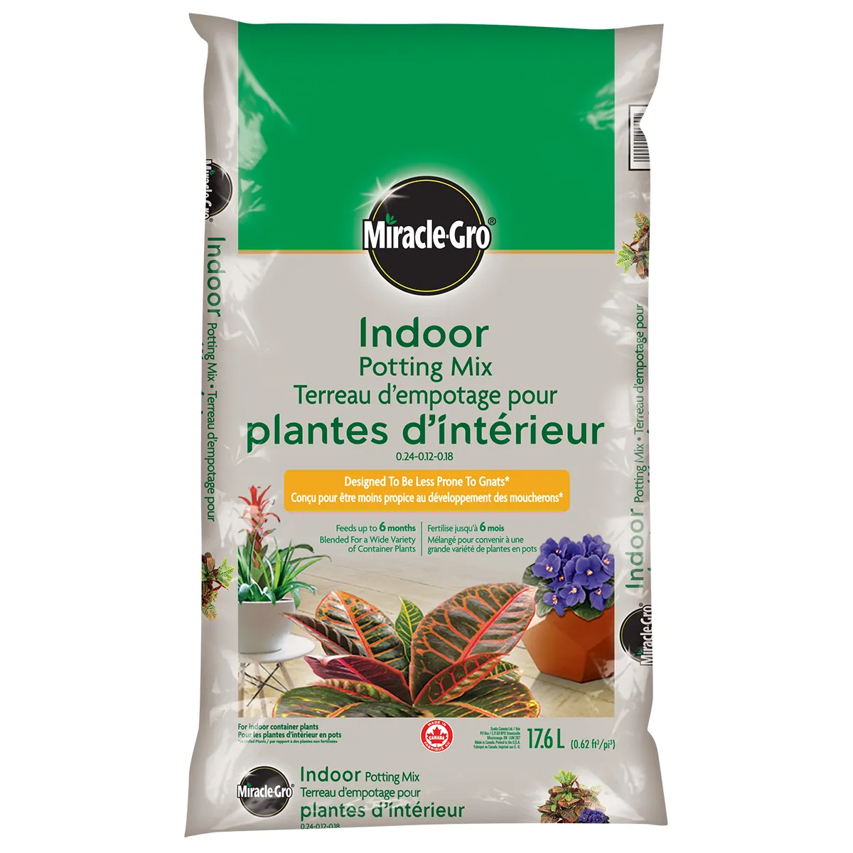- Miracle-Gro® Indoor Potting Mix feeds houseplants for up to 6 months and is designed to be less prone to gnats (contains no compost or bark; which are known to shelter fungus gnats).