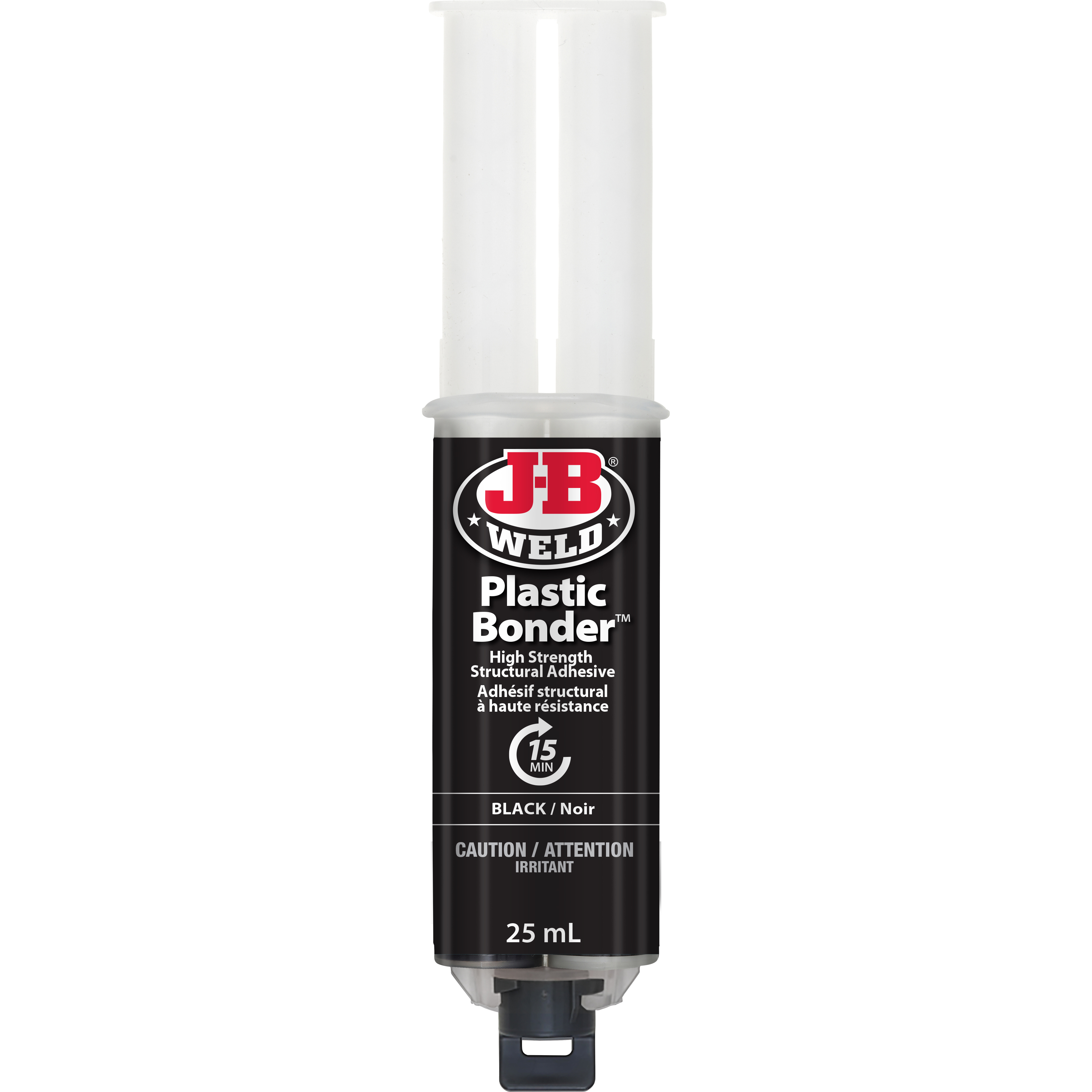 PlasticBonder™ is a quick-setting; two-part; urethane adhesive system that provides strong and lasting repairs and works on thermoset; carbon fiber composites; thermoplastics; coated metals; concrete & more. PlasticBonder™ has a 1:1 mixing ratio; sets in 15 minutes and can be sanded after 30 minutes. With a tensile strength of 3770 PSI; PlasticBonder™ sets black in color and cures to a hard; permanent bond.