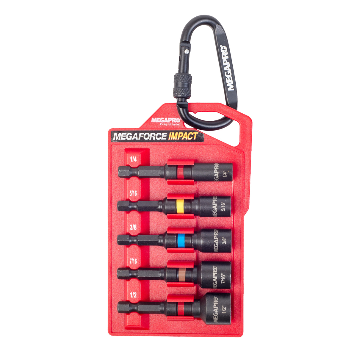 MEGAPRO Metric Impact Nutsetters come in a clip pack of 5 containing sizes of 6mm; 7mm; 8mm; 10mm and 12mm. The impact nutsetters are made of machined S2 steel; for long lasting durability. A black oxide finish helps protect against corrosion. They are also color coded for easy size identification.