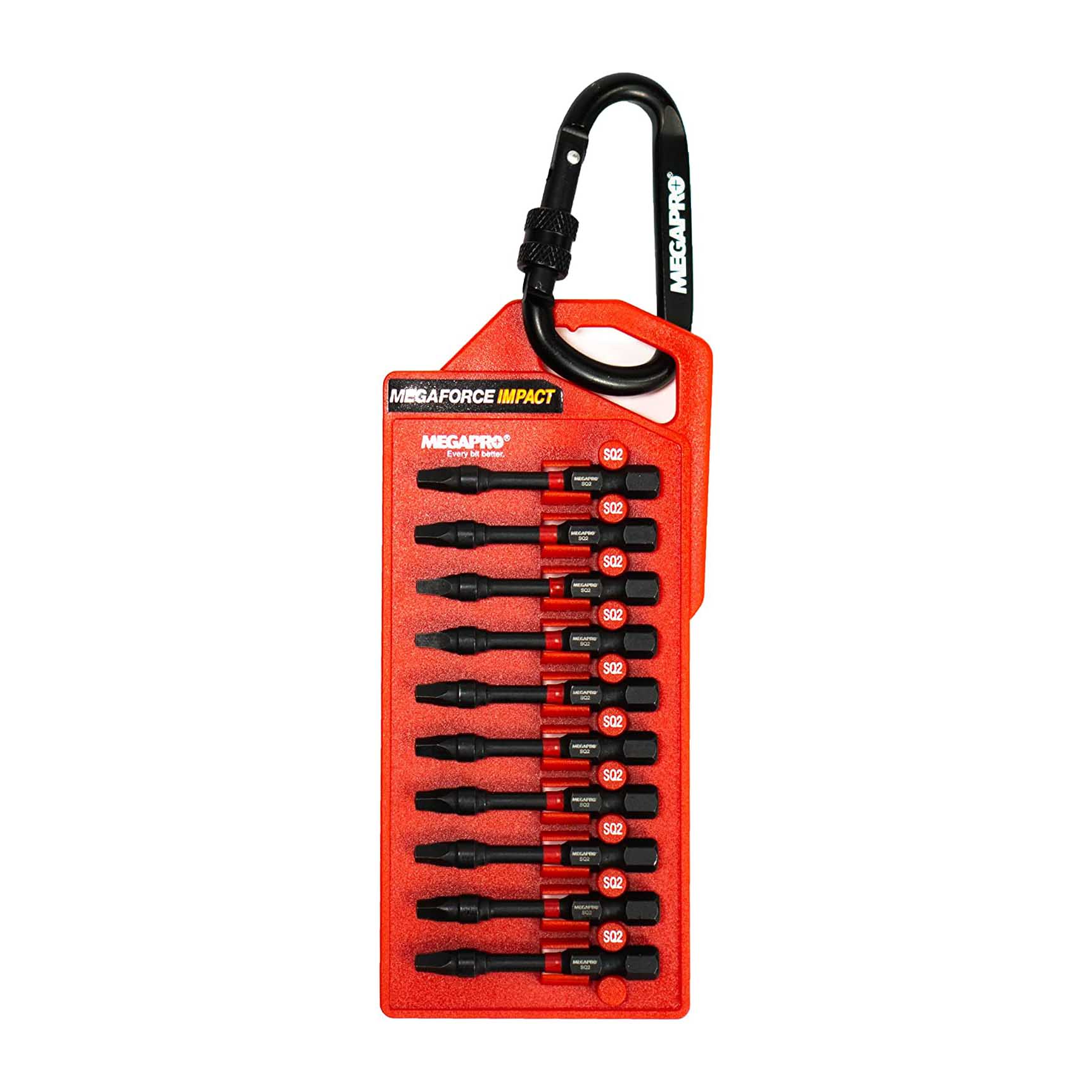 Megapro’s Industrial-grade MegaFORCE Impact bits are made from a specially modified S2 Steel to absorb high impact shock and provide maximum durability and performance. Bits are 2in long and coated in black oxide for corrosion protection. Each bit size is color-coded for easy-to-find selection and the pack comes with a carabiner clip that can be quickly attached to your toolbox or belt. This set includes ten #2 Square Impact Bits.