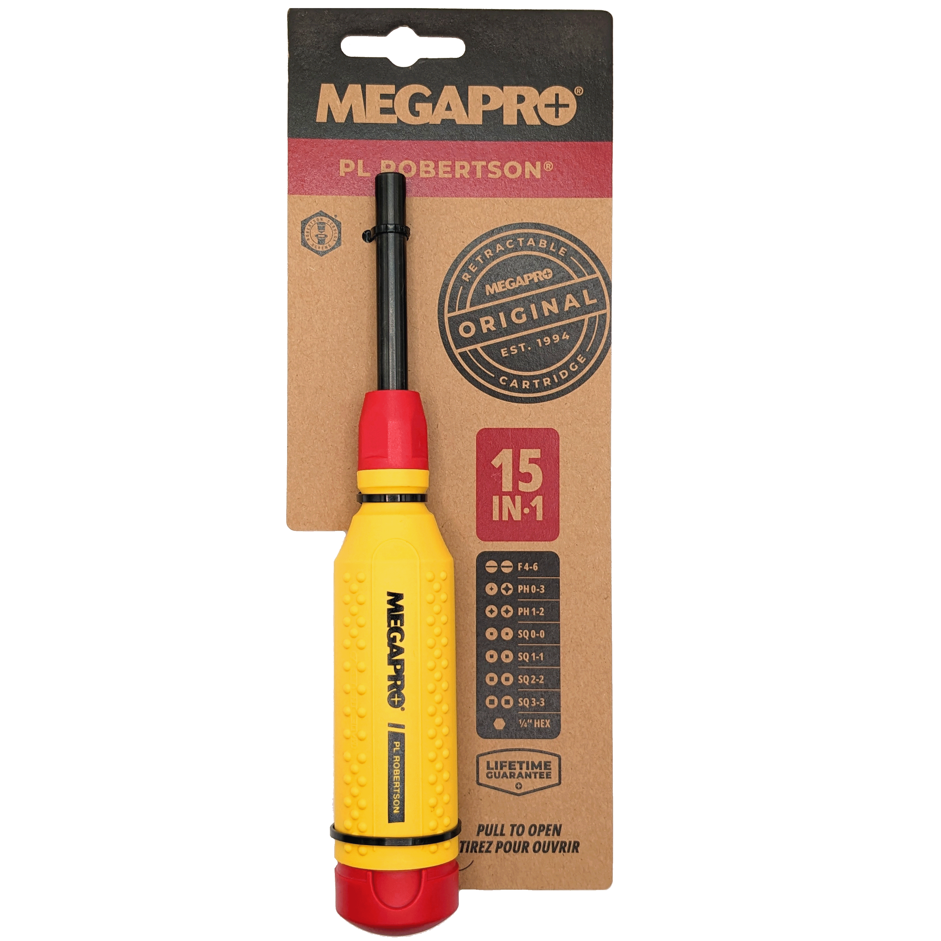 Custom loaded multi-bit screwdriver with 4 authentic Robertson bits with the patented “cling fit” grip; plus the most common Flat and Phillips bits. Carded Package.