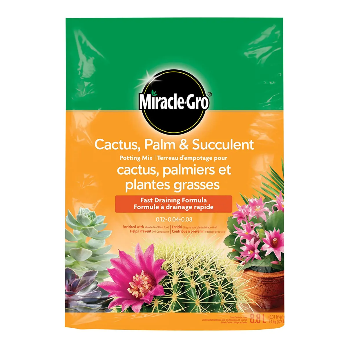 8.8 L (0.31 ft3) bag fills approximately 2 x 20 cm (8 in) containers Succulents may seem independent; but they still need a little TLC. Give it to them with Miracle-Gro® cactus; palm & succulent potting mix 0.07-0.03-0.05. This potting mix contains a crafted blend of forest products; sphagnum peat moss; sand and perlite; plus nourishing Miracle-Gro® plant food to feed for up to 6 months. Drains fast. Doesn’t compact. That means it helps keep things light and airy; so cacti; palms and other succulents can thrive.