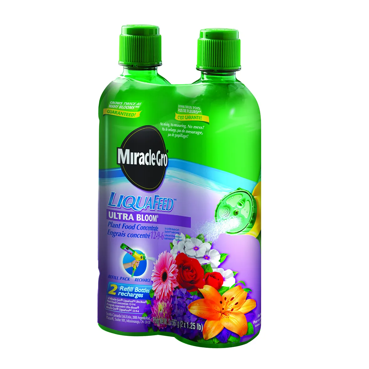 Miracle-Gro® Liquafeed Ultra Bloom Plant Food Refill Bottles can be used on a wide variety of plants and trees including flowers; vegetables and other houseplants. Miracle-Gro® Liquafeed Ultra Bloom Plant Food Refill Bottles consist of a formula that allows for automatic mixing of the plant food with water at the correct rate. This saves you the need for guesswork. This product can keep your plants fed for up to 14 days when applied during the regular watering process.