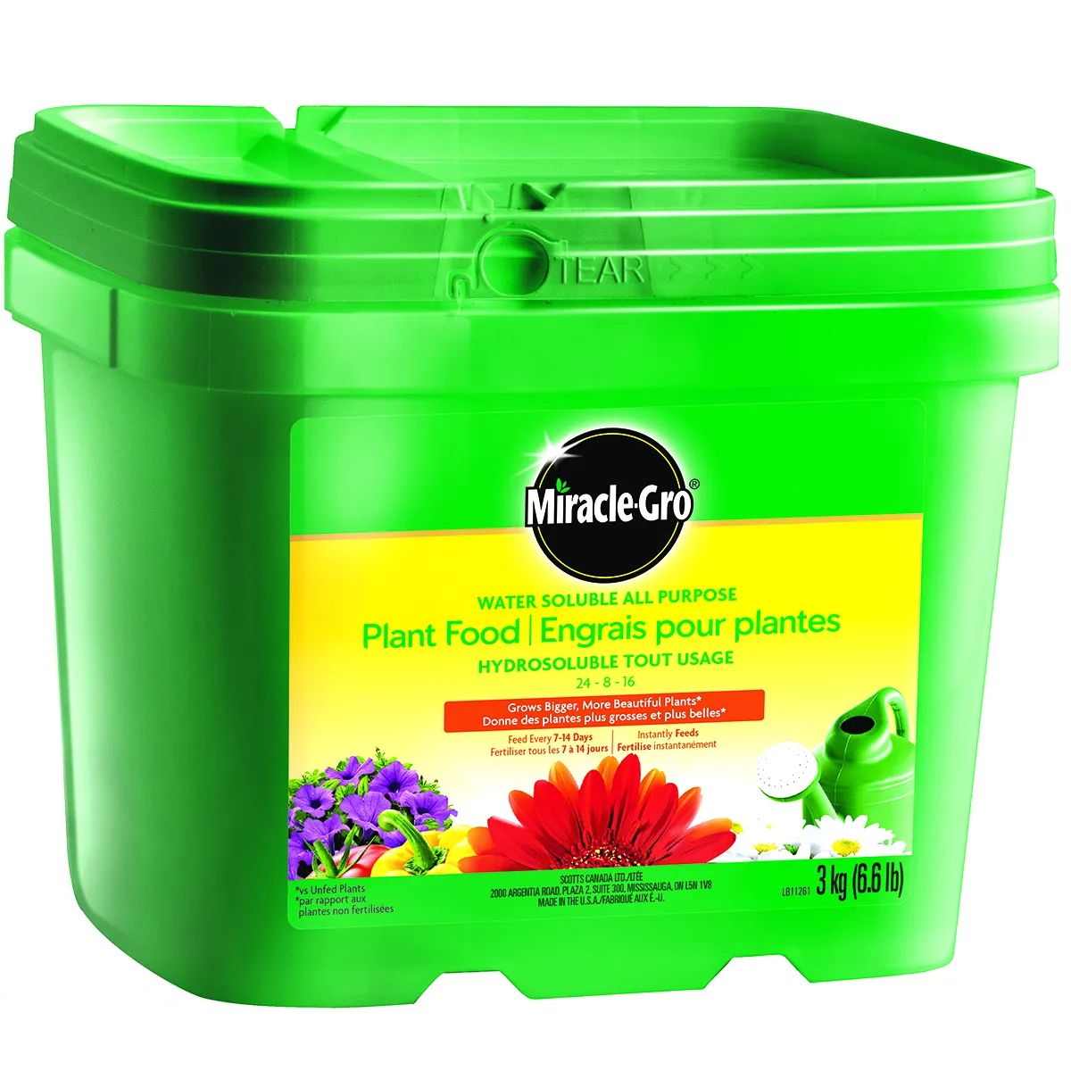 Keep all your plants healthy; happy and well fed with Miracle-Gro® water soluble all purpose plant food 24-8-16. This is the all-purpose plant food that has it all easy to use; works instantly and provides quick; beautiful results. Works on all flowers; all vegetables; all trees and all shrubs. Grows Bigger; More Beautiful Plants. Plus; Miracle-Gro® water soluble All purpose plant food 24-8-16 mixes up fast with just water. Feed with a watering can or for even more convenience; use one packet and a garden hose with the one-handed Miracle-Gro® garden feeder.