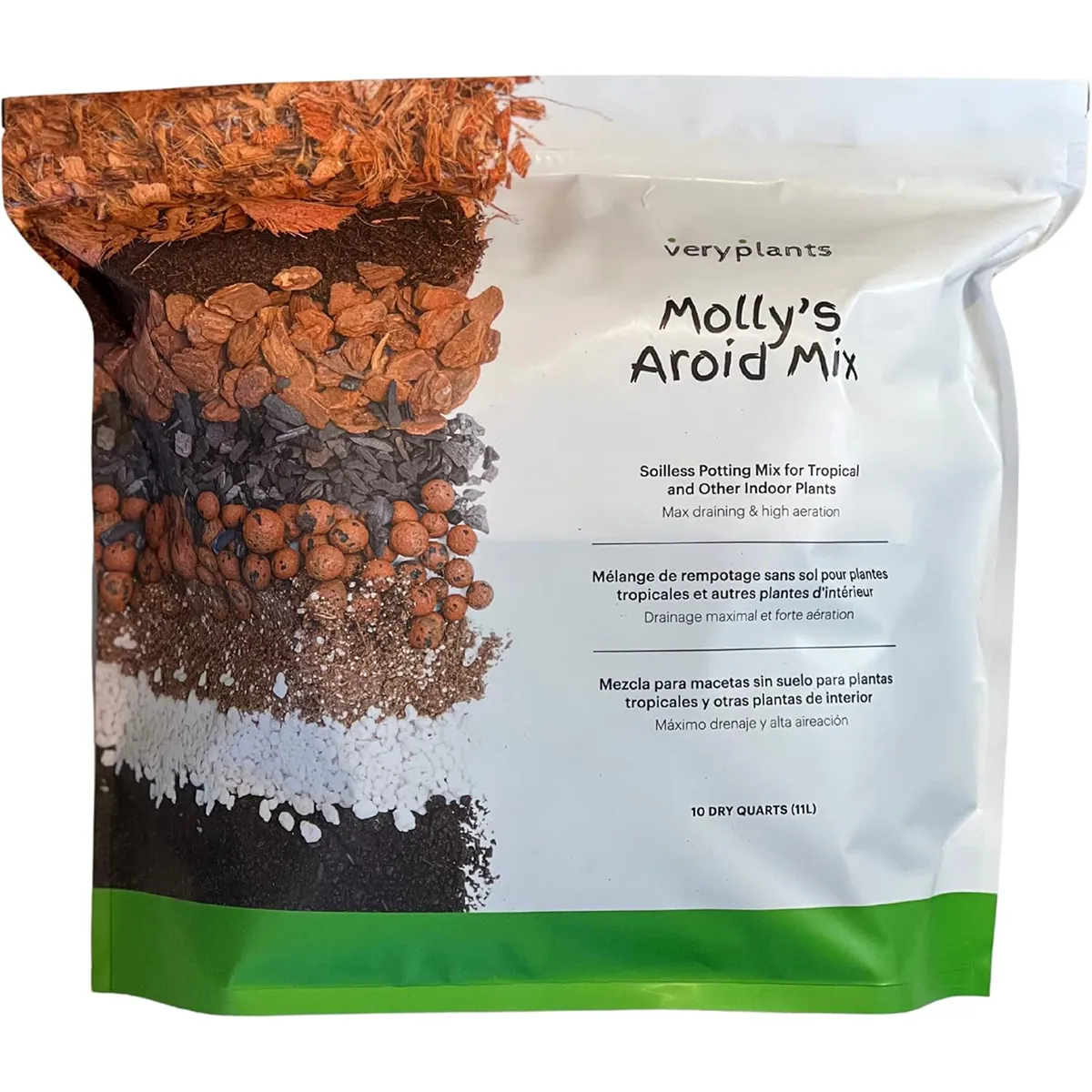 Molly's Aroid Mix is an exceptional; soil-free potting mix; crafted for tropical and other indoor plants that thrive in a chunky; well-aerated; and fast-draining environment. This mix ensures that the potting mix doesn’t remain overly moist after watering. It is especially suitable for a wide range of plants including Palm; Ficus; Anthurium; Calathea; Aglaonema; Fiddle Leaf; Alocasia; Monstera; Philodendron; Pothos; and other tropical and indoor varieties.